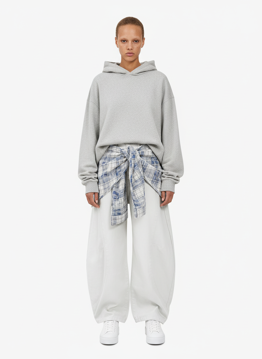 Layered Plaid Shirt-Tied Waist Barrel Jeans