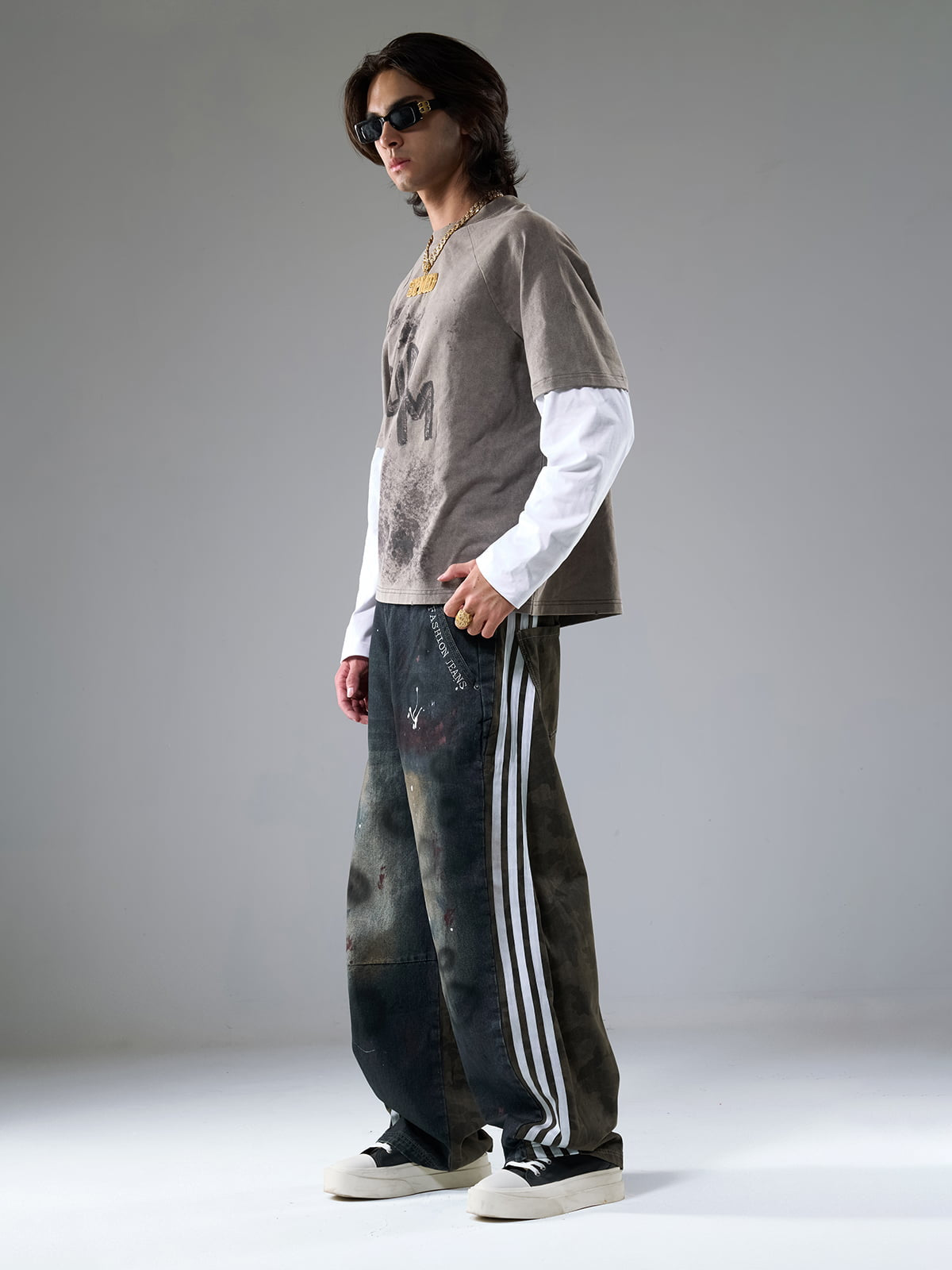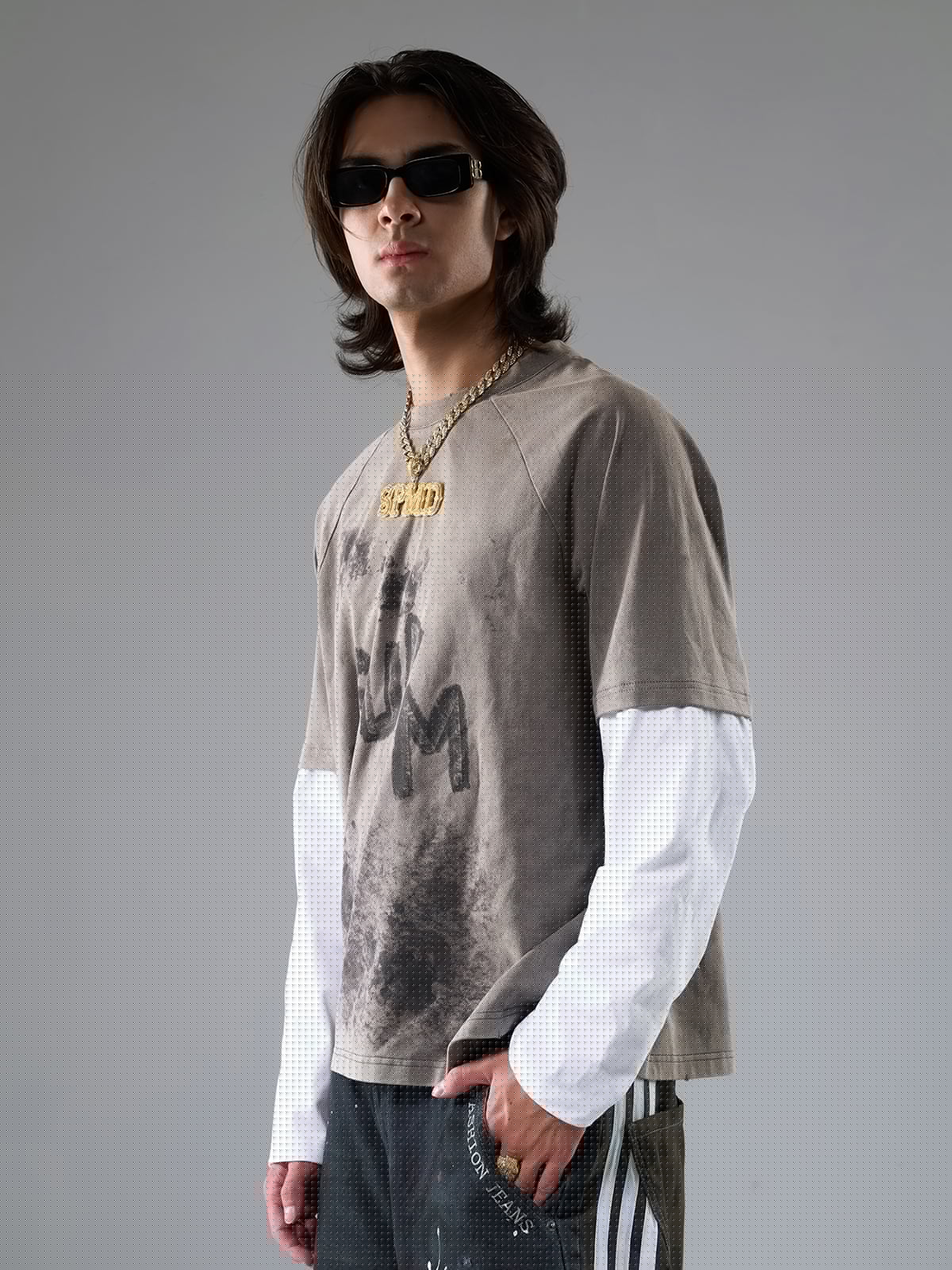 • Design Elements: Bold graphic print on the front, layered look with visible inner sleeves