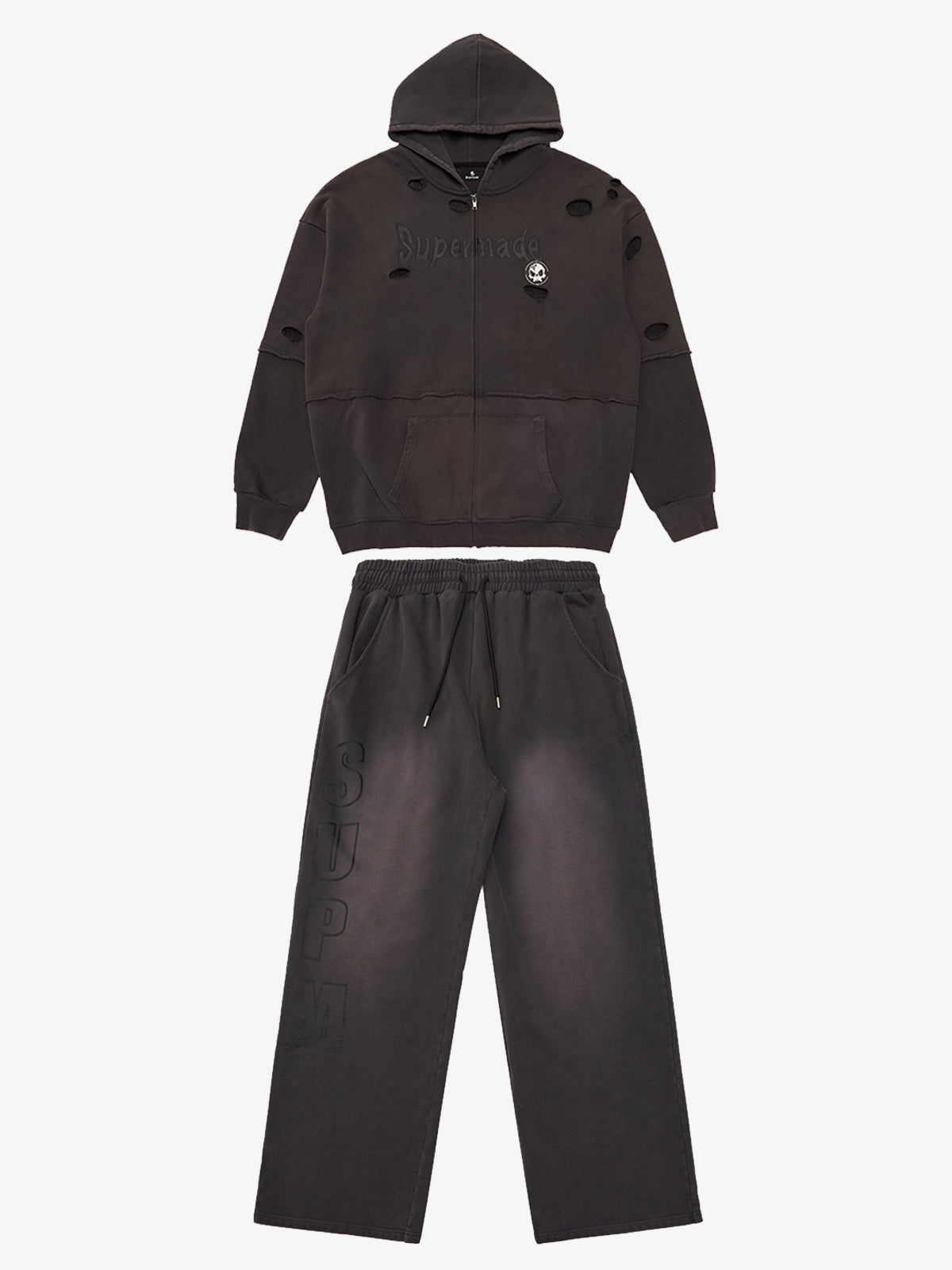 Original Washed & Ripped Skull Cardigan Cotton Hoodie Set