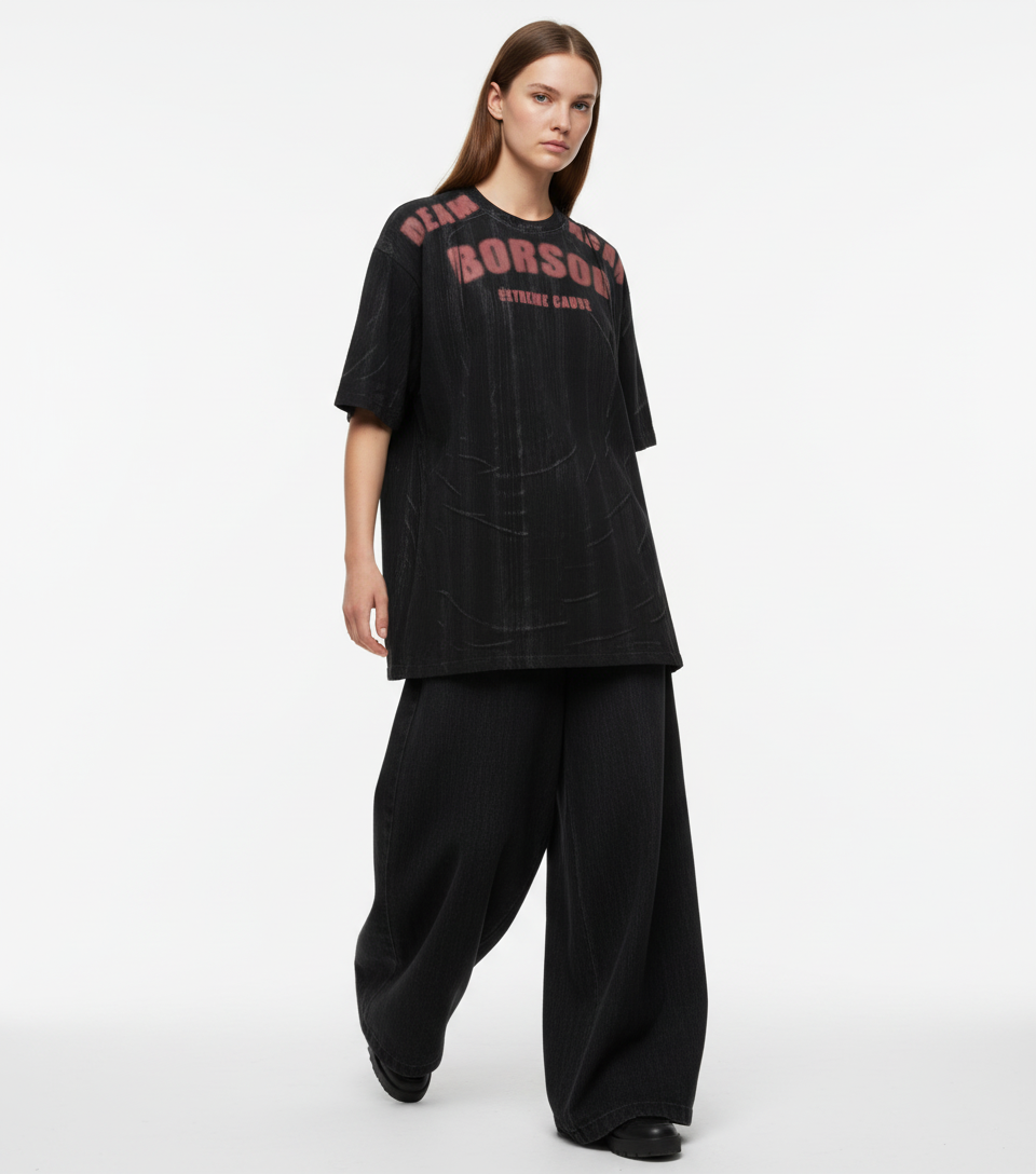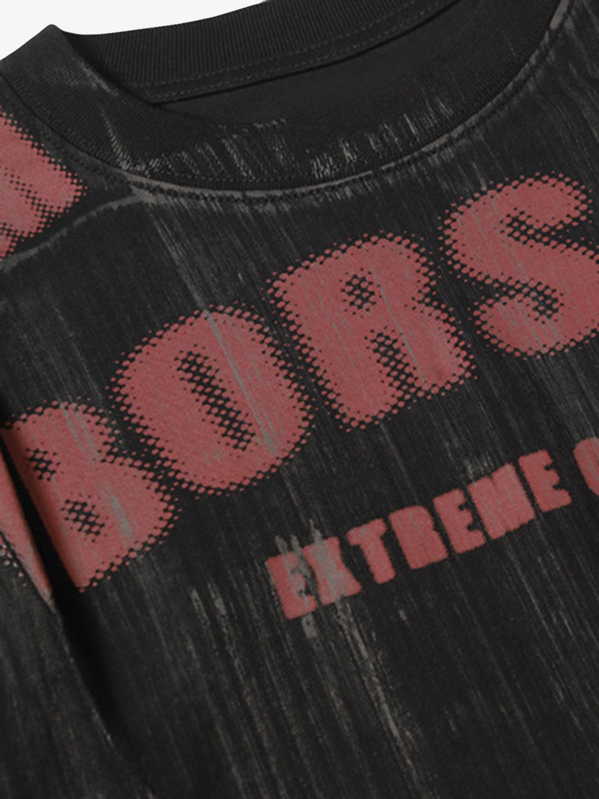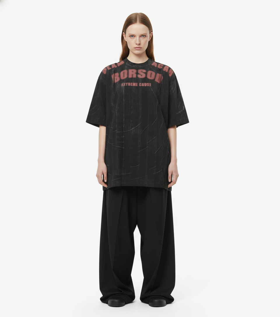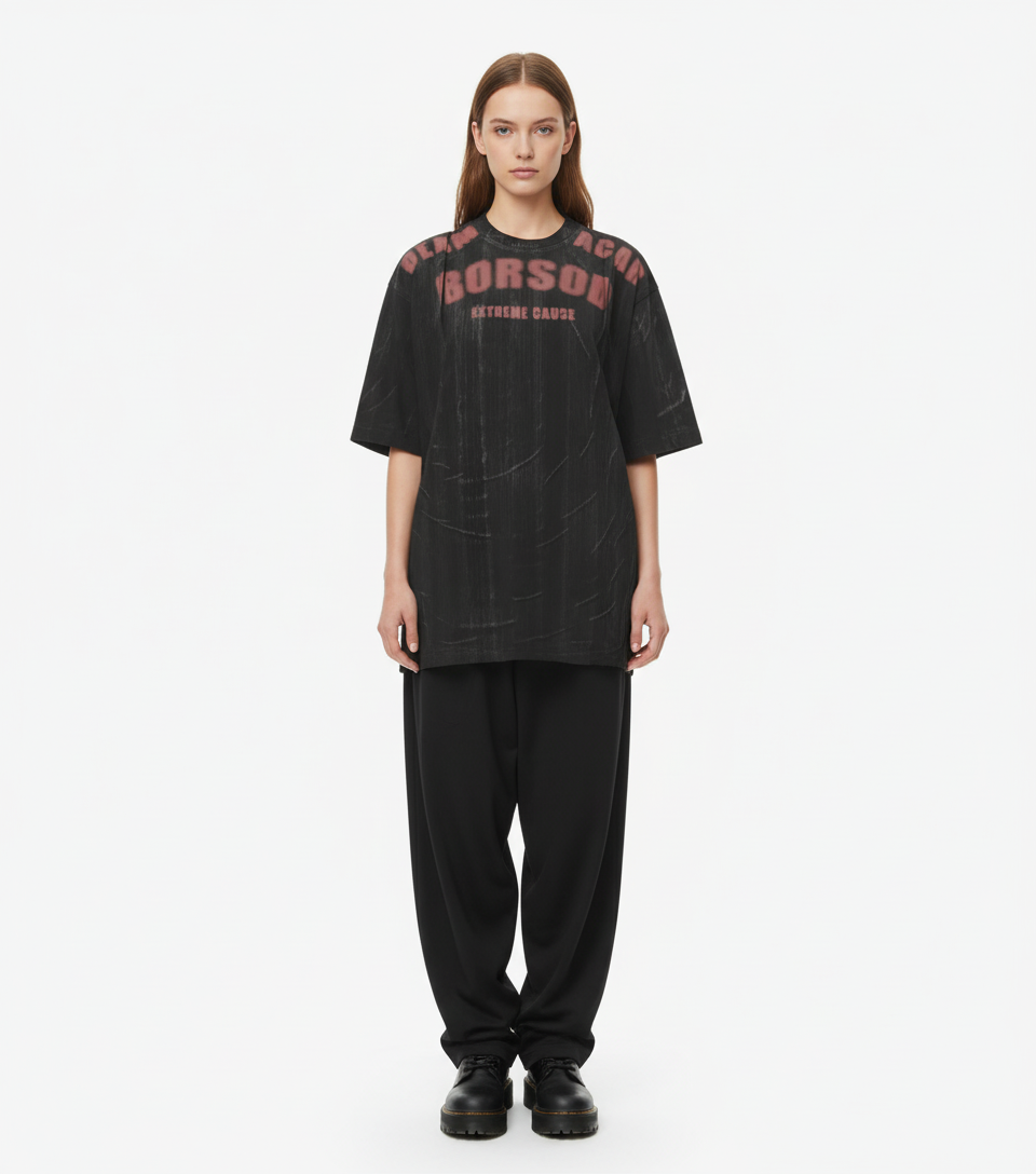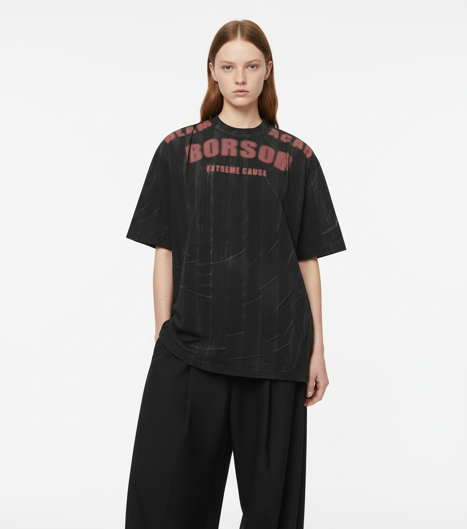 • Design Elements: Bold graphic print with eye-catching text design, distressed texture effect