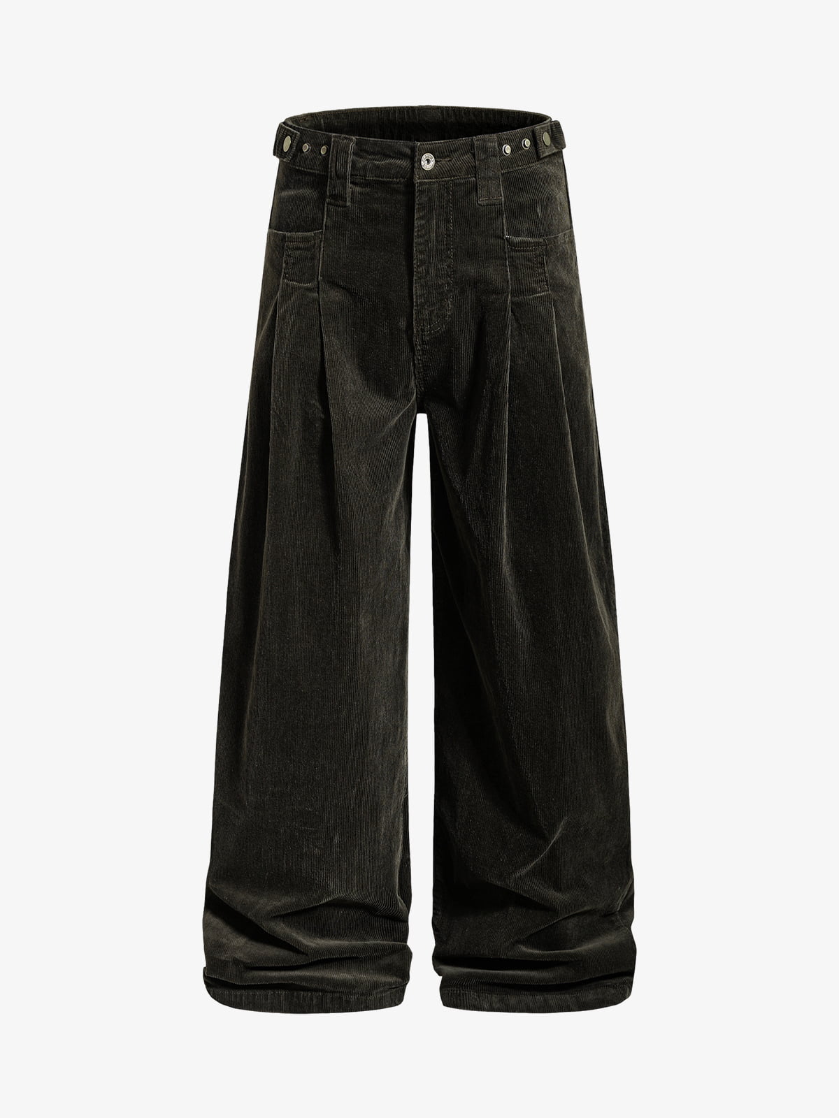 Crafted from plush, heavy-gauge corduroy, these wide-leg trousers redefine vintage utility. Featuring an exaggerated baggy silhouette and front pleat detailing, they provide a structured yet relaxed "stacked" look. Finished with adjustable waist tabs and reinforced stitching, these pants are the ultimate foundation for a high-fashion streetwear outfit.