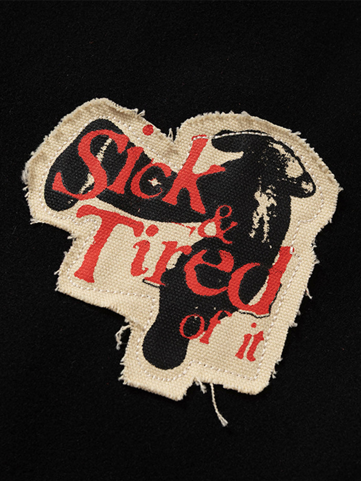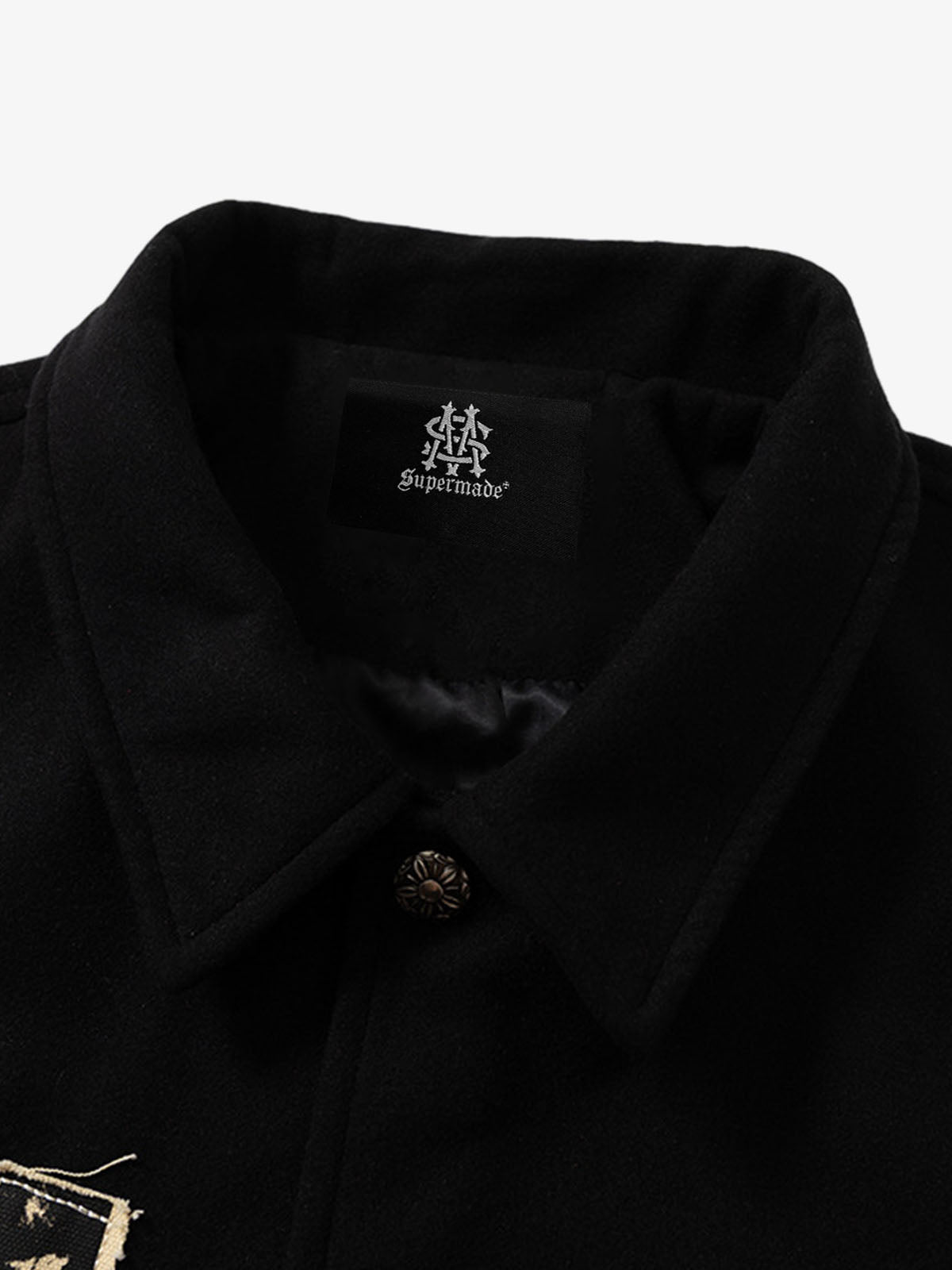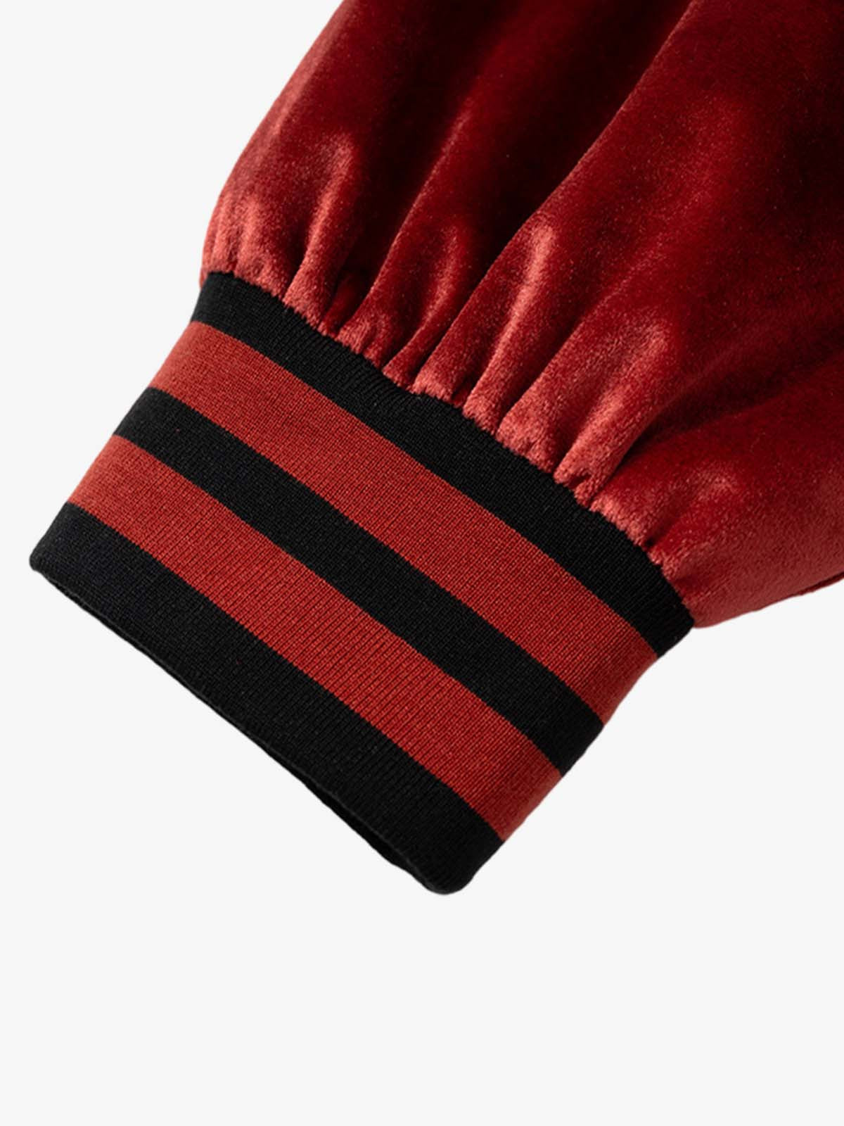 • Design Elements: Bold graphic prints on the chest and sleeves, contrasting sleeve colors, button closure