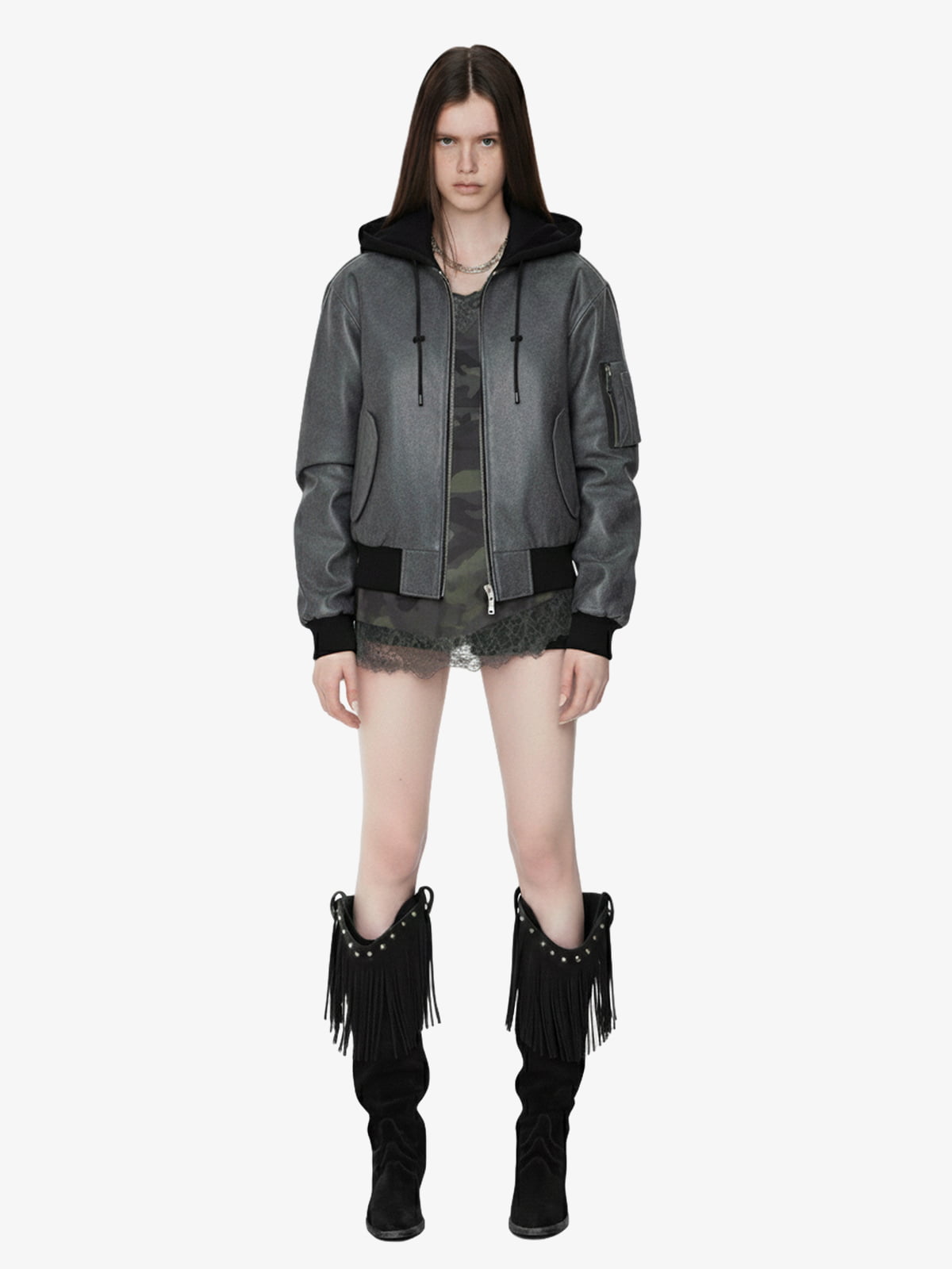 Retro Leather Faux Two-Piece Hooded Padded Bomber Jacket