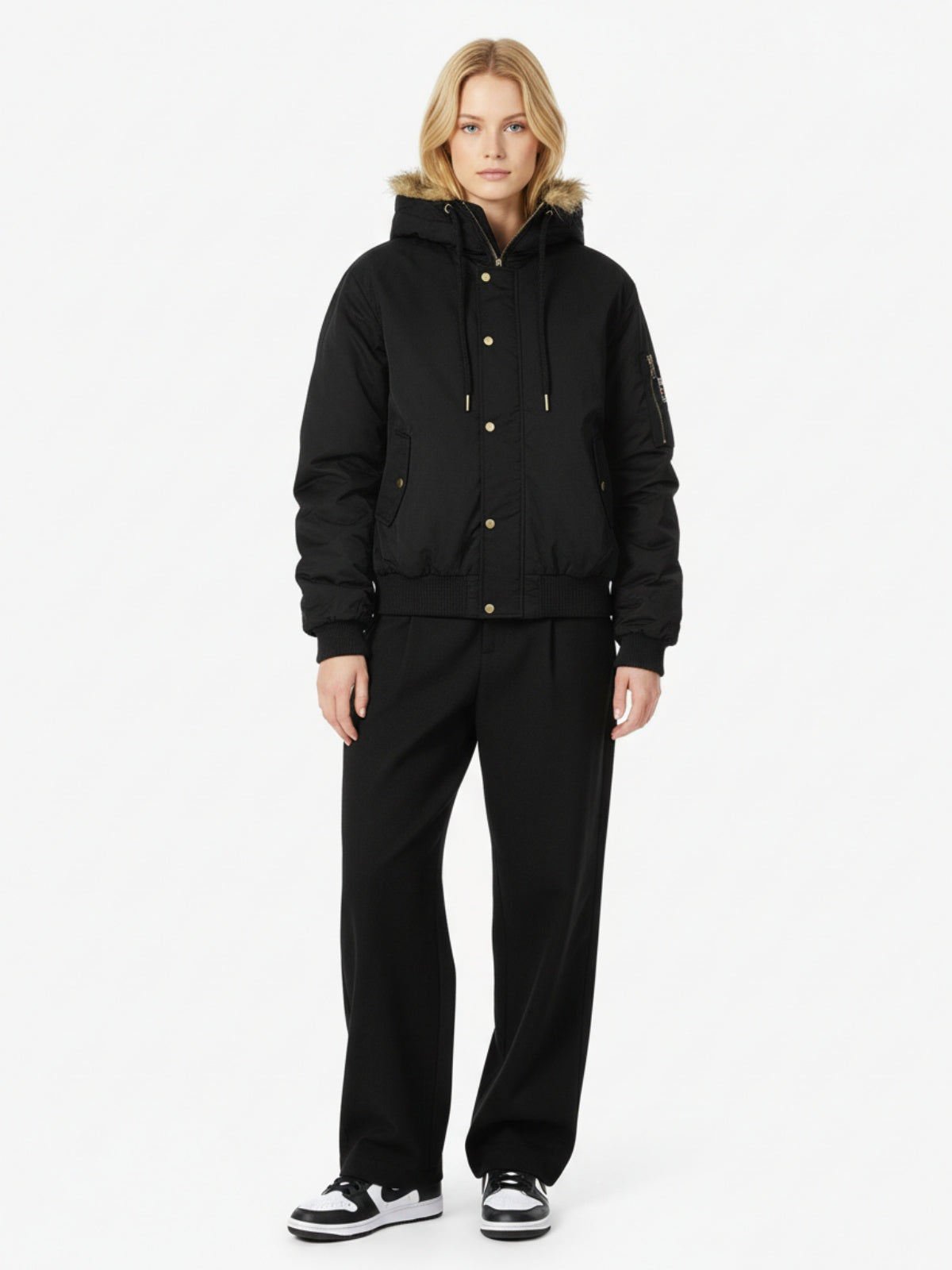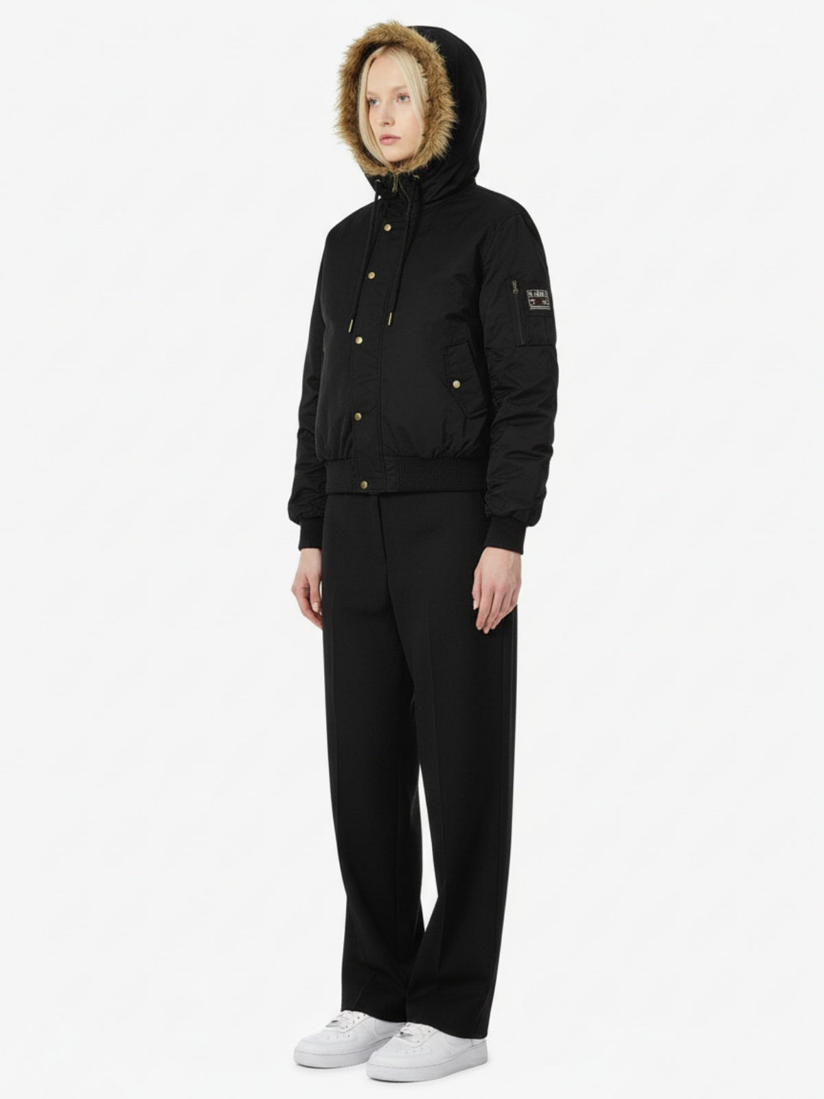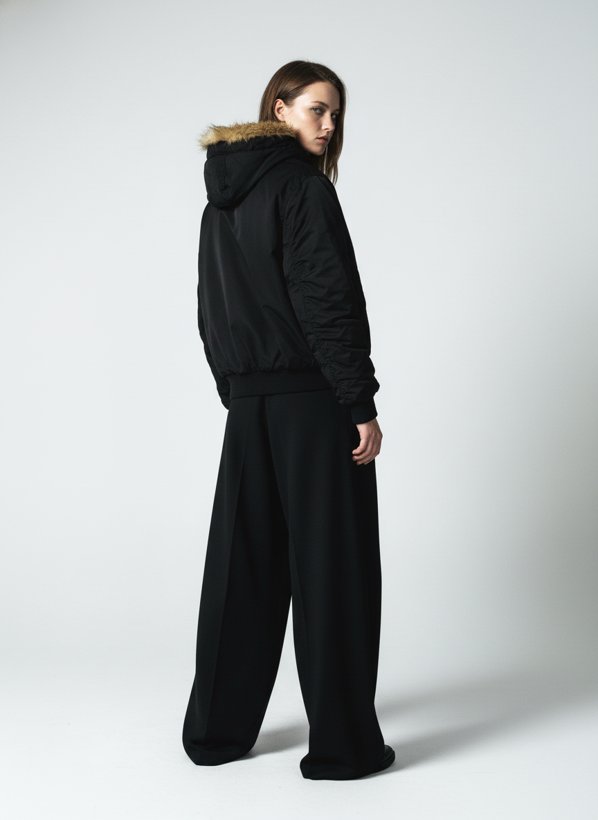 • Design Elements: Detachable fur-lined hood, gold-tone snap buttons, and a sleek front zipper closure