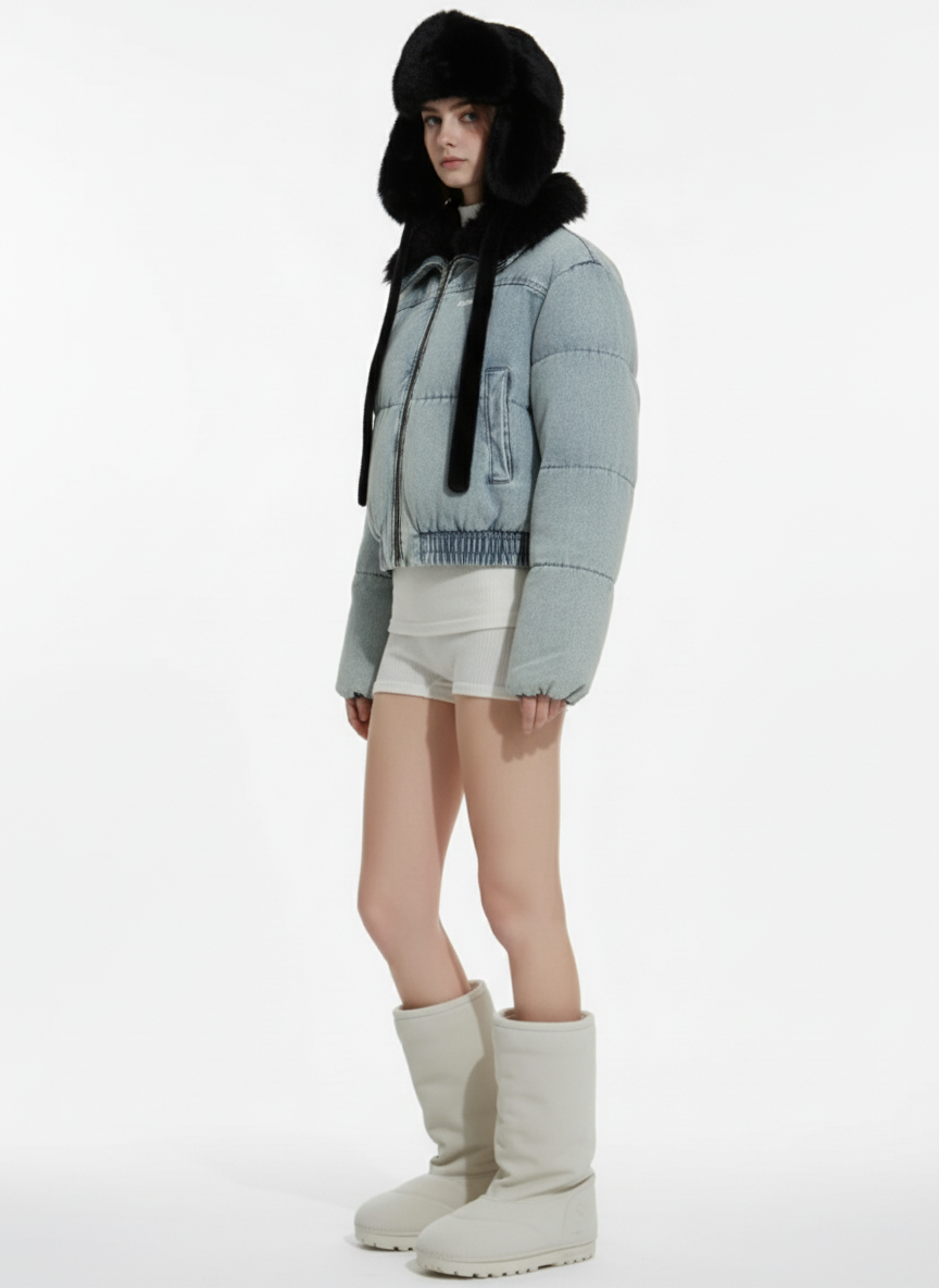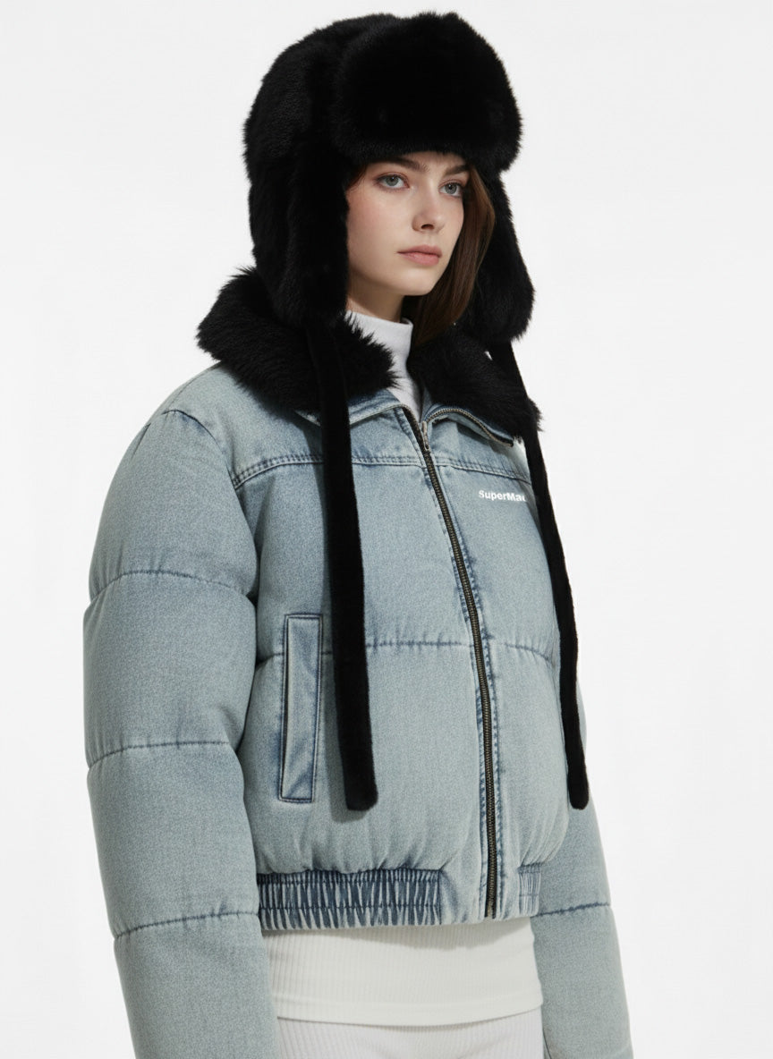 Retro Washed Denim Faux Fur Collar Quilted Jacket