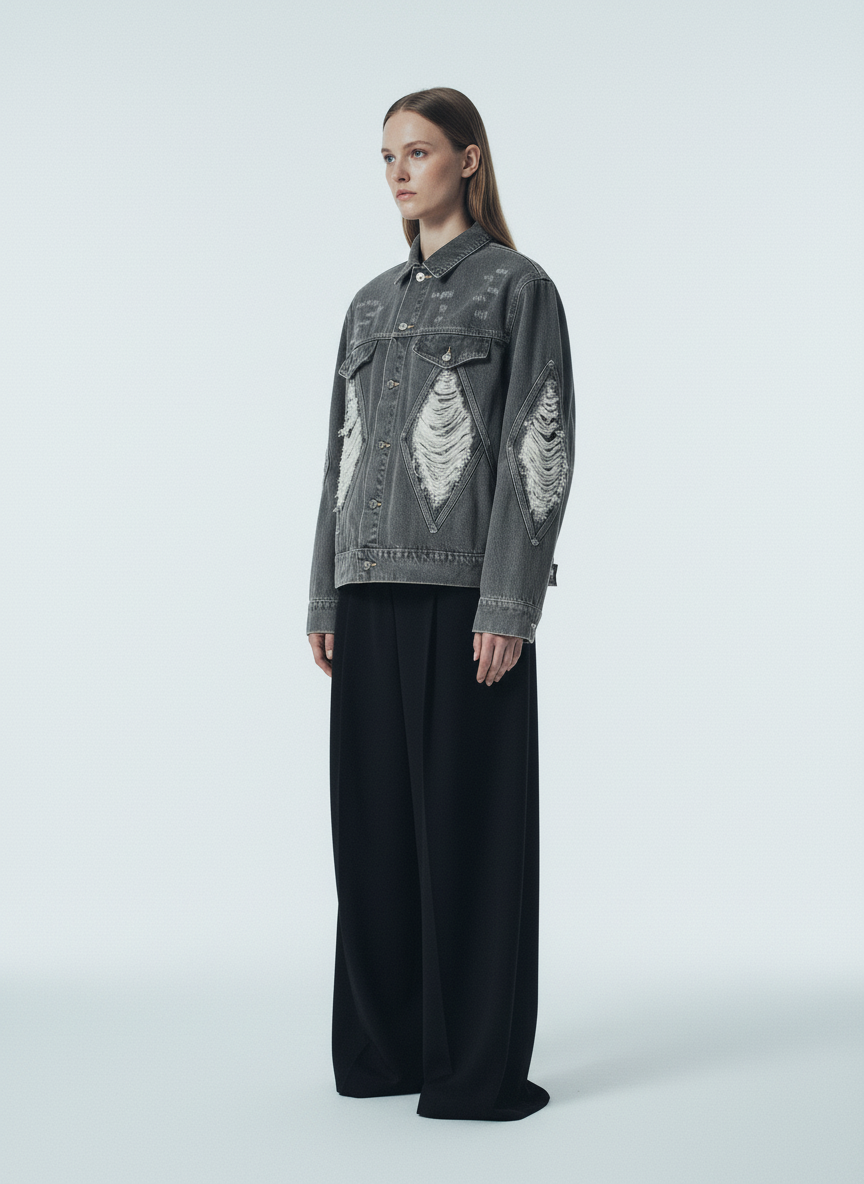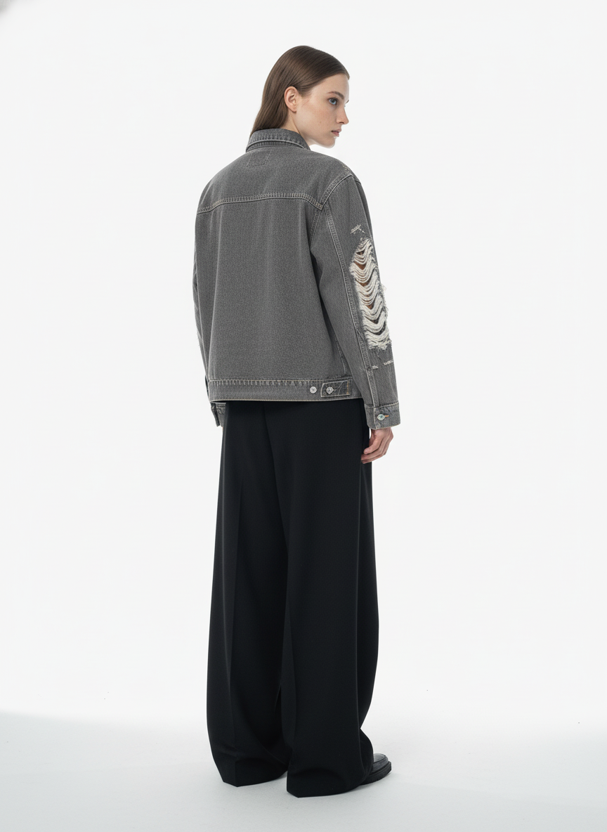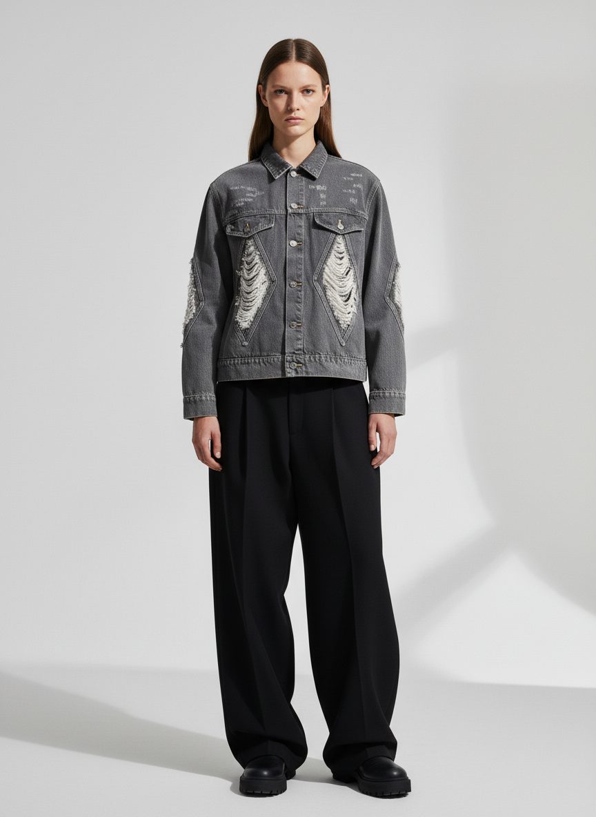 • Design Elements: Distressed patches on the chest and sleeves, faux fur accents