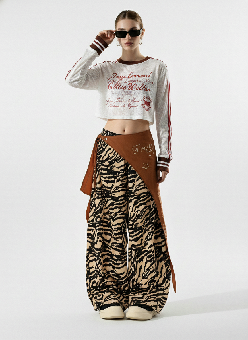 • Design Elements: Tiger Print Pattern, Embroidered Stars, and Asymmetric Hemline