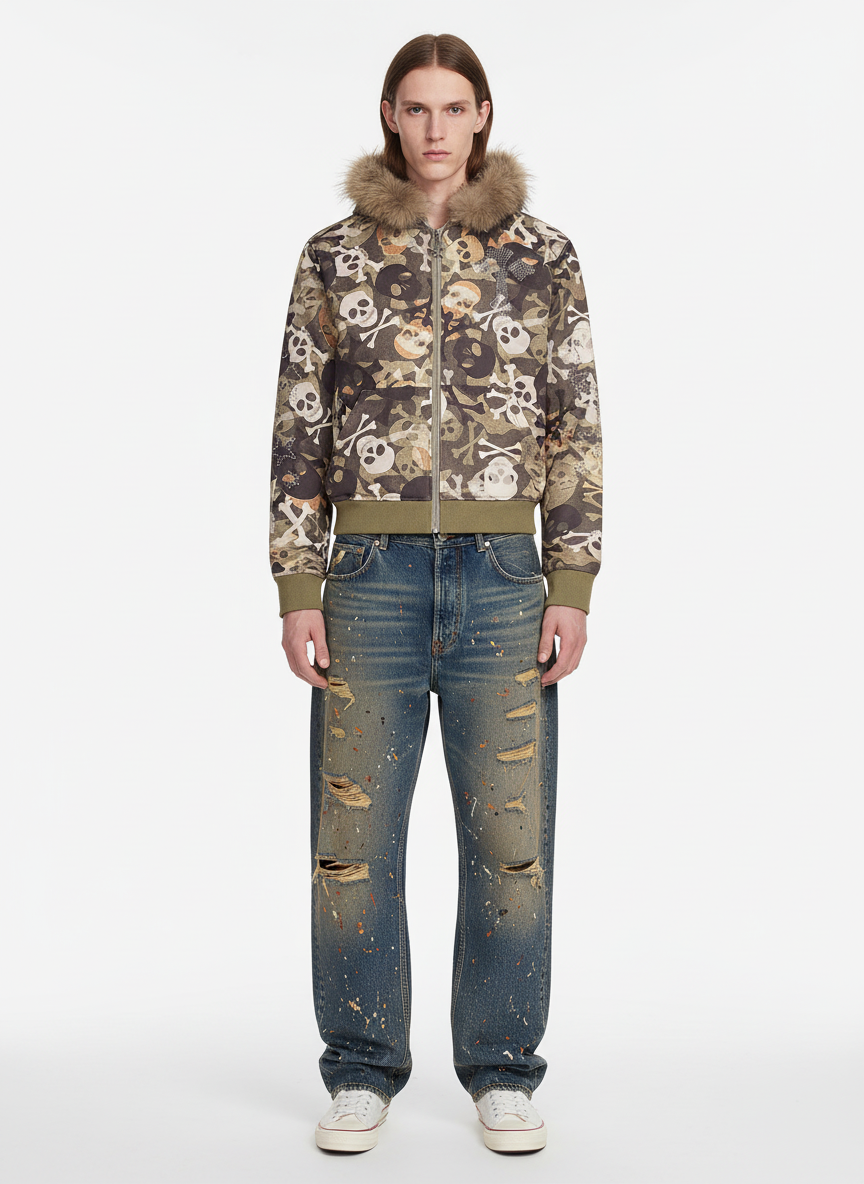 • Design Elements: Skull and crossbones prints, camouflage pattern, faux fur hood trim
