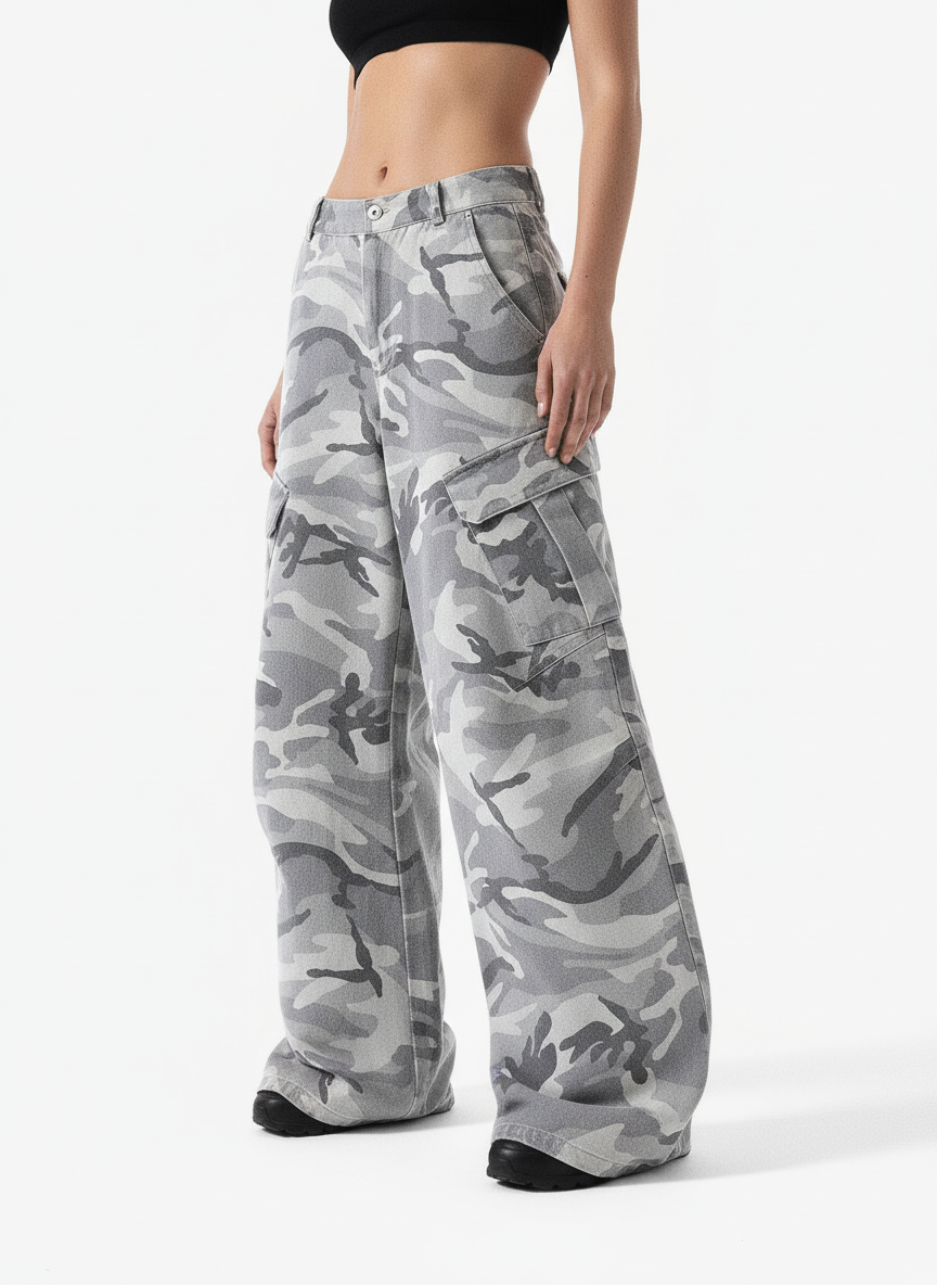Woven Snow Camouflage Machete Wide-Leg Cargo Barrel Pants