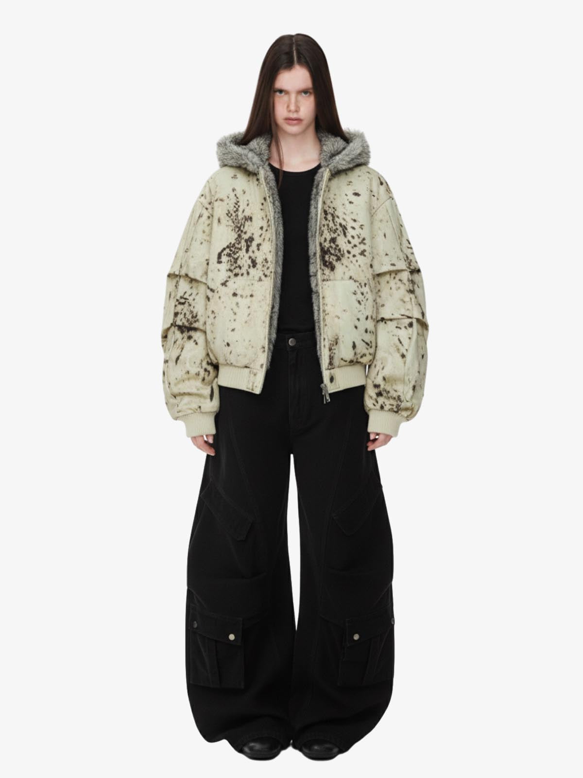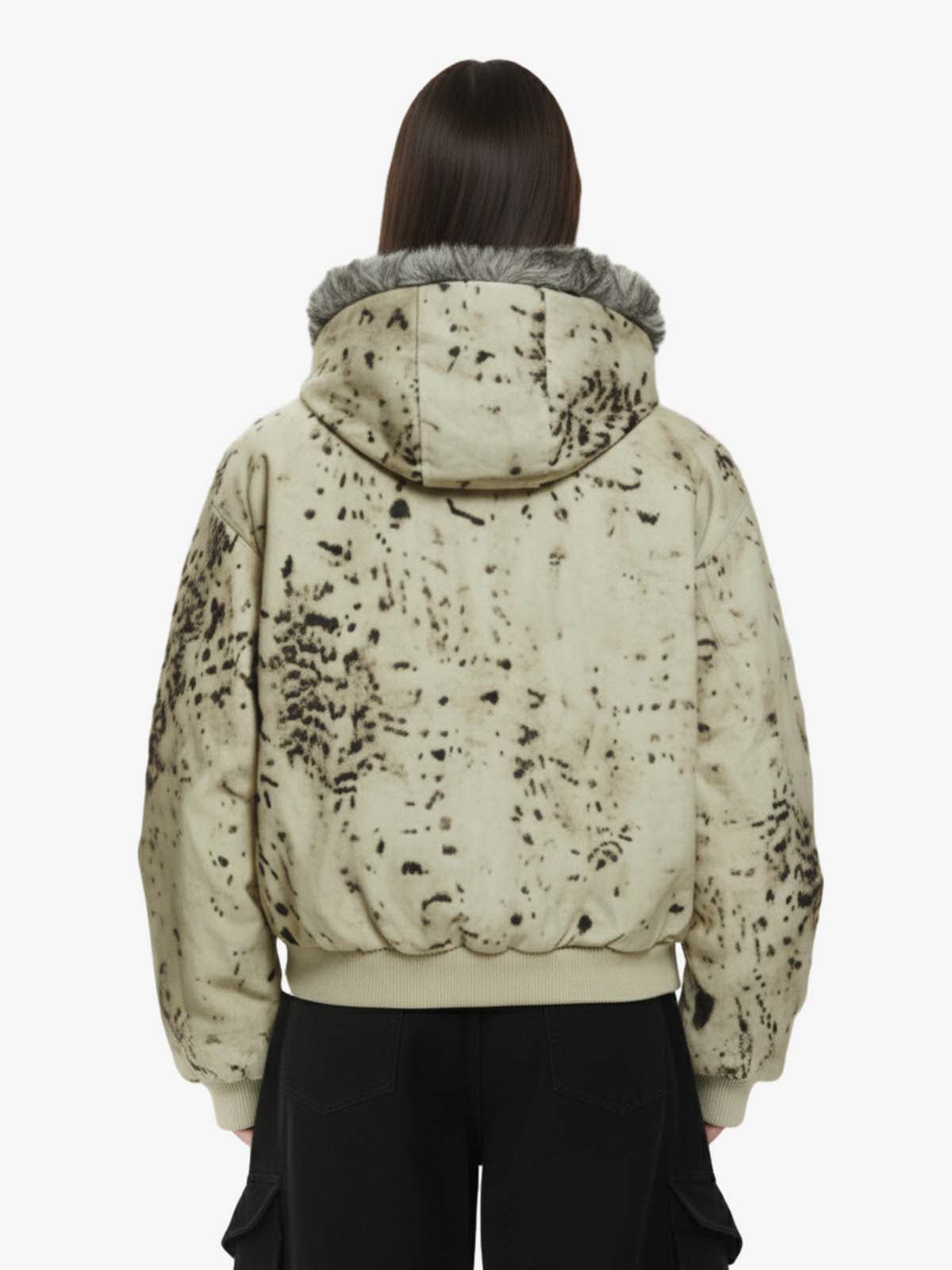 Splatter Print Faux Fur Collar Ruched Sleeve Zip-Up Jacket