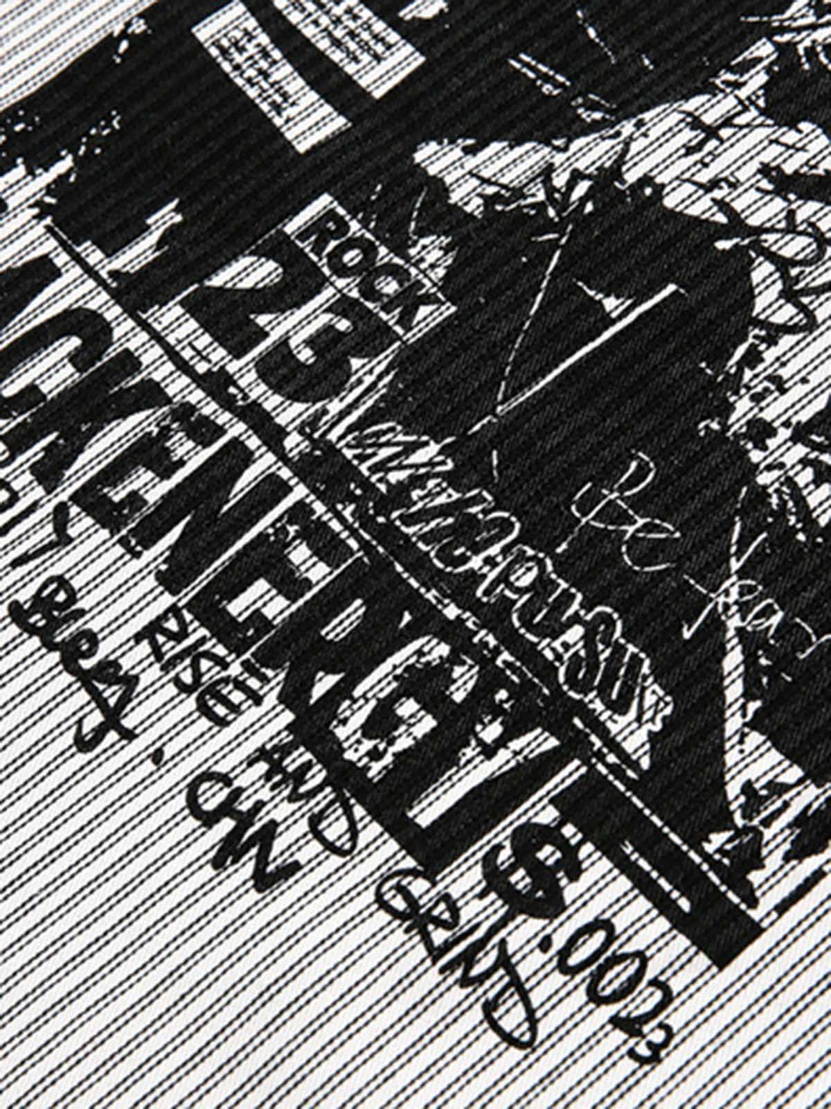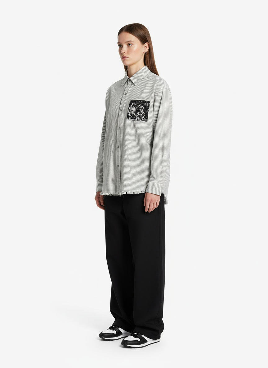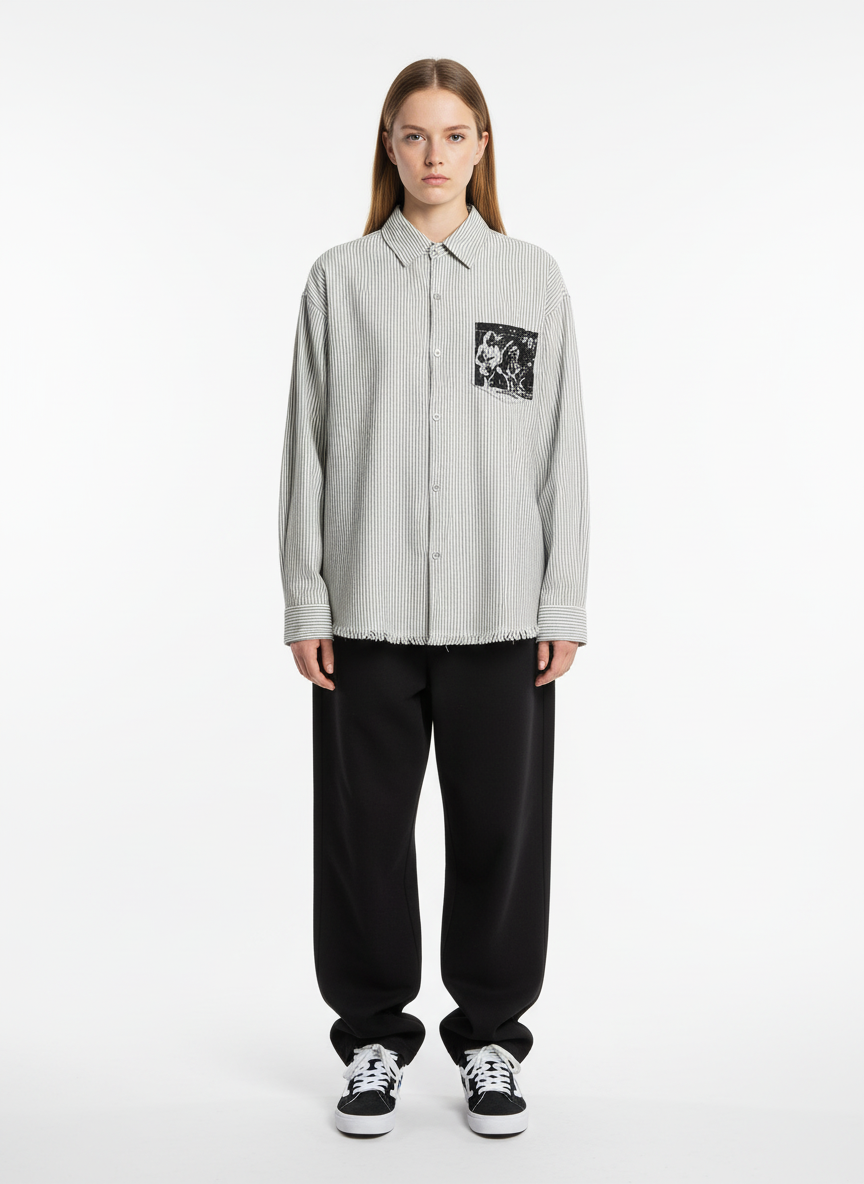 • Design Elements: Chest graphic pocket, vertical stripe pattern, frayed hem detail