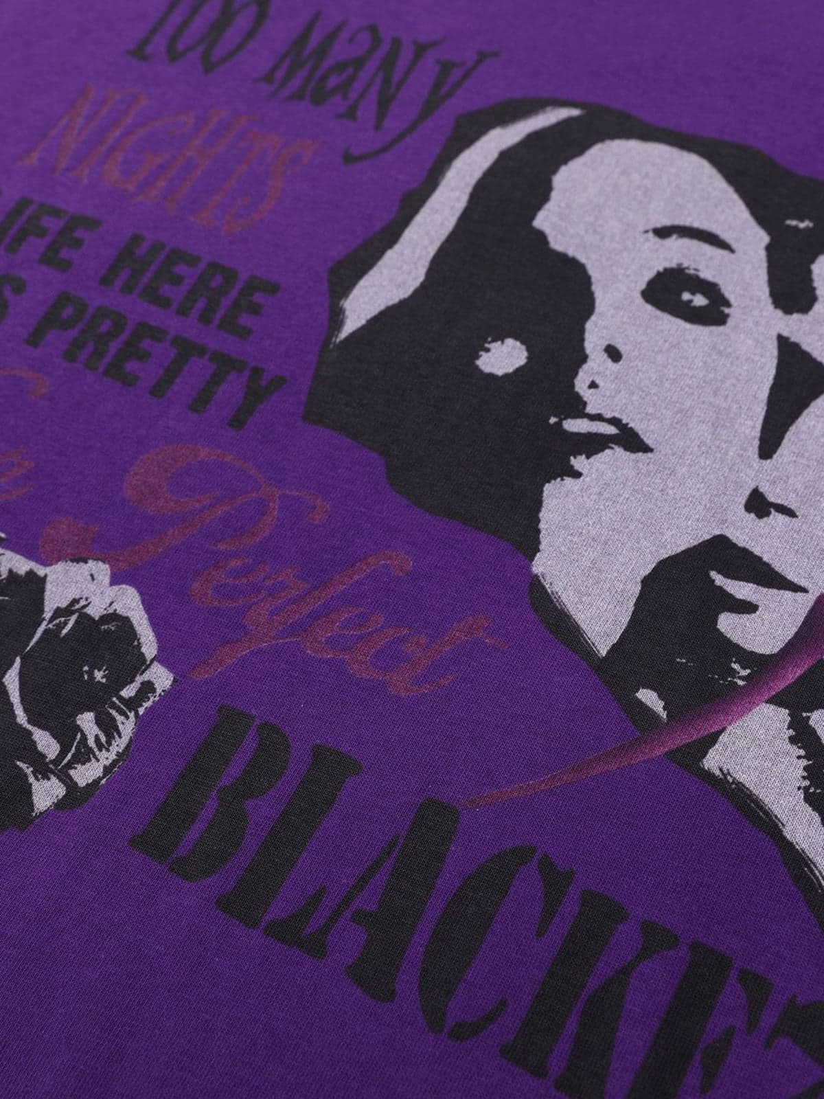 • Design Elements: Unique graphic print with artistic faces and text, bold brushstroke accents