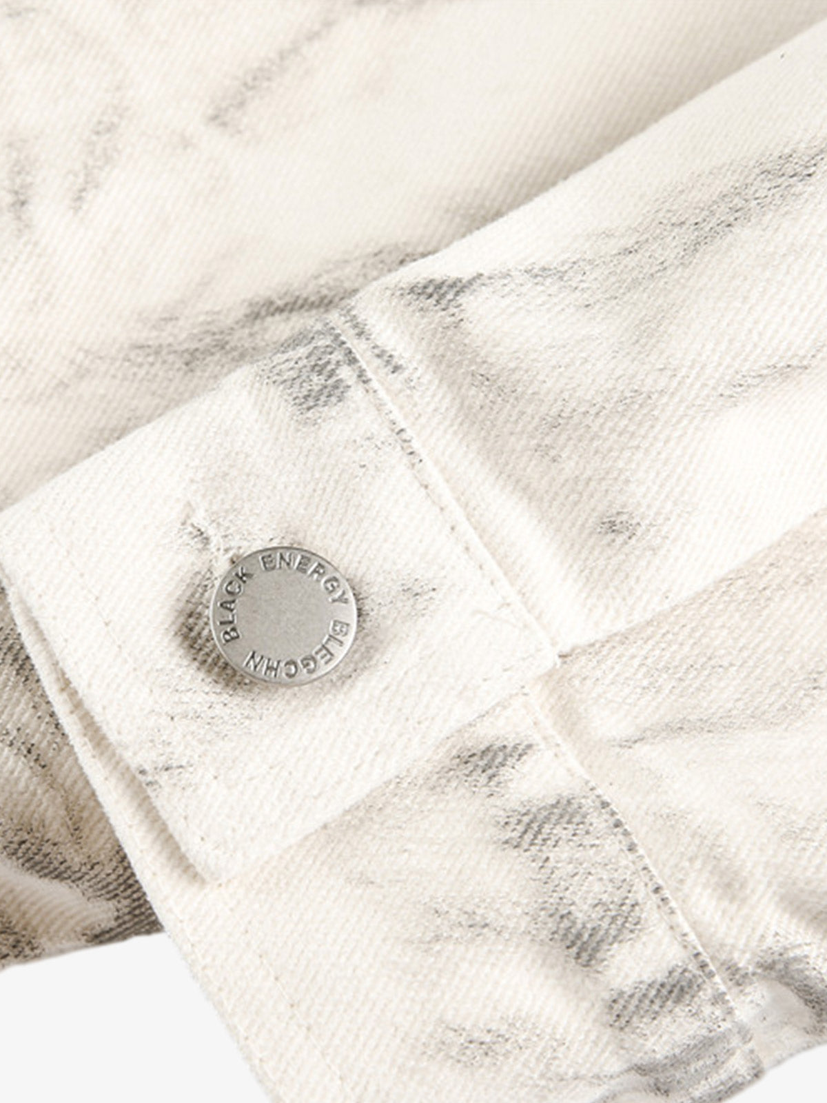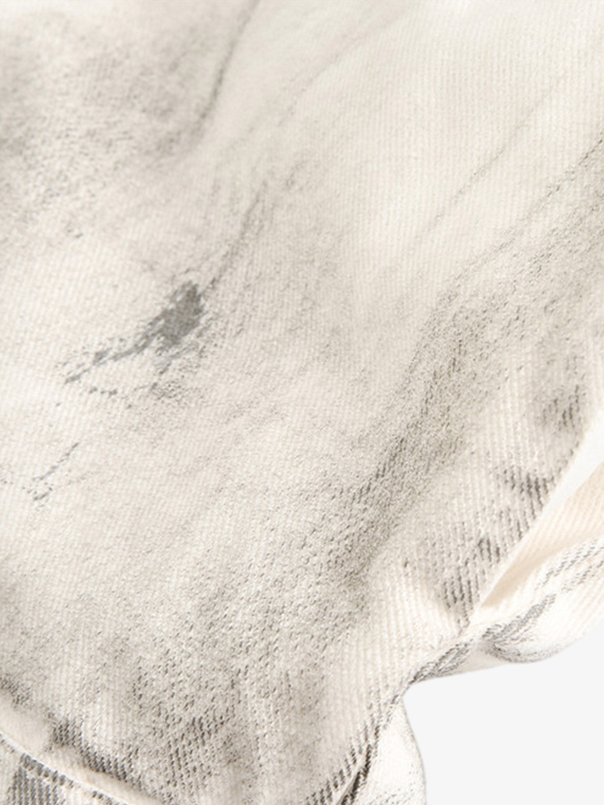 • Design Elements: Bold back graphic print, distressed details, adjustable waist tie