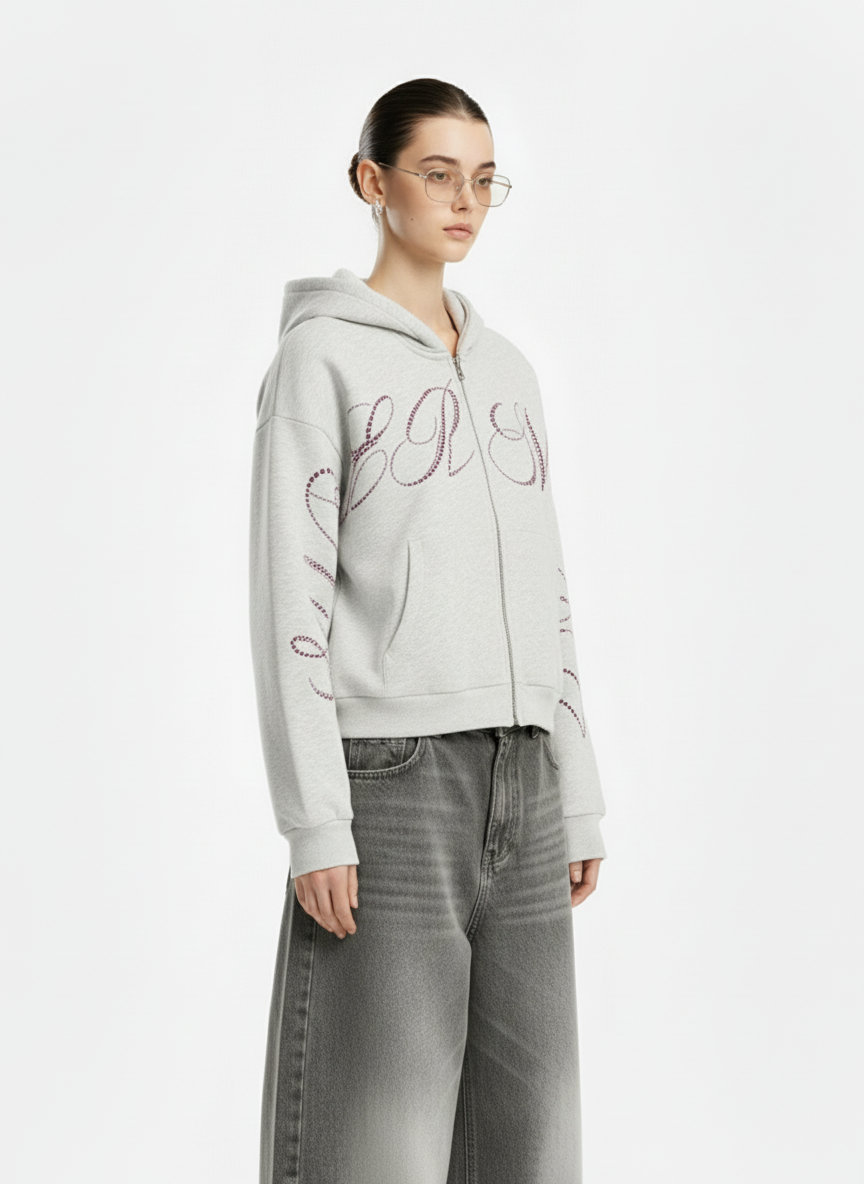 • Design Elements: Sparkling letter embellishments, hooded design, front zipper closure