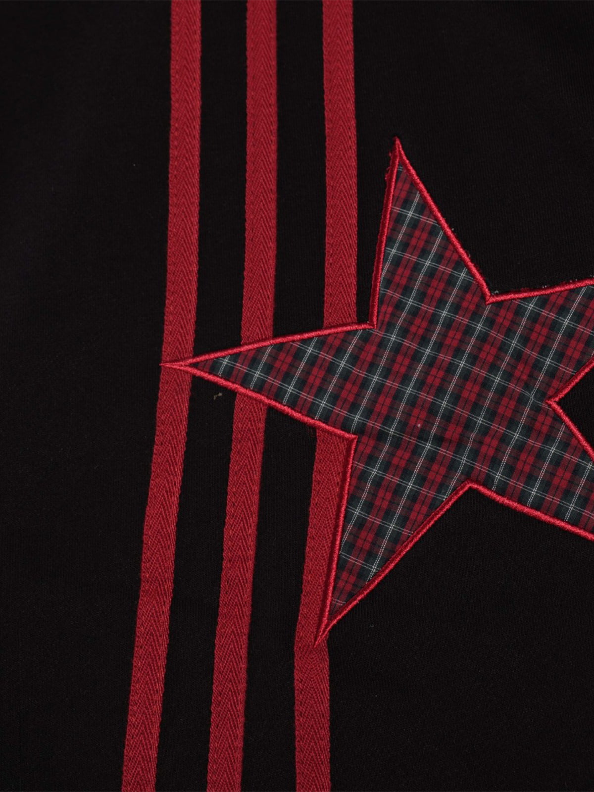 • Design Elements: Red plaid star patches, red vertical stripes, relaxed fit