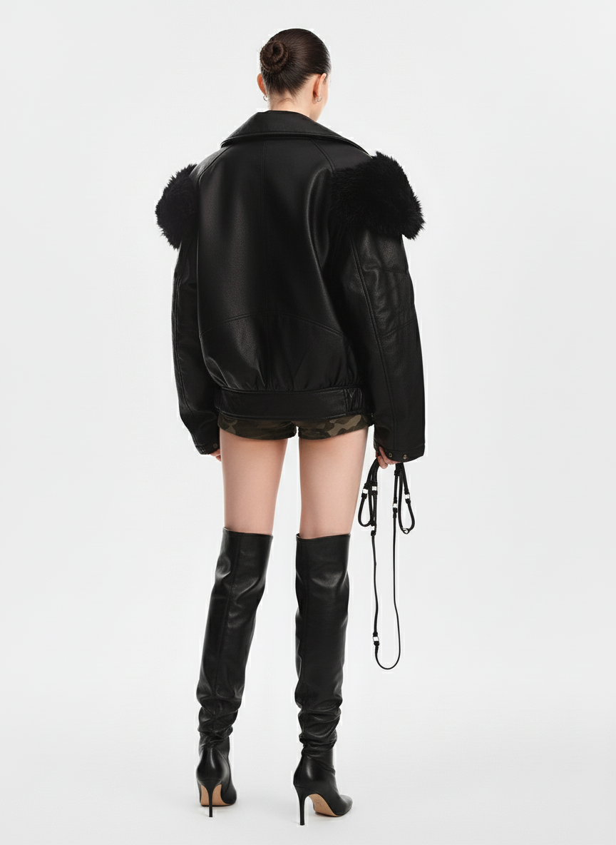 Retro Detachable Fur Collar PU Multi-Pocket Bomber Jacket
