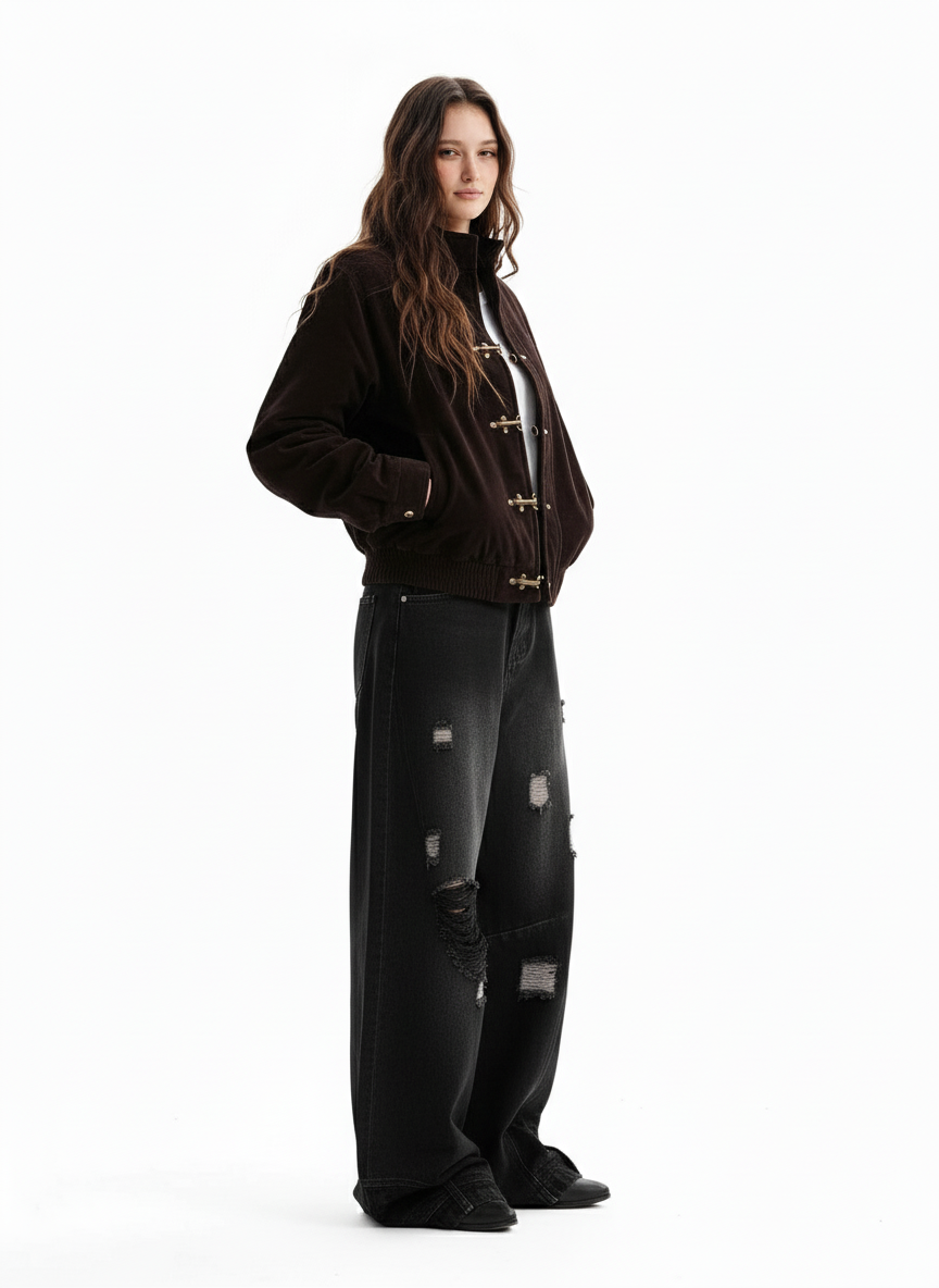 Vintage Suede Embroidered Toggle-Buckle Stand Collar Down Jacket