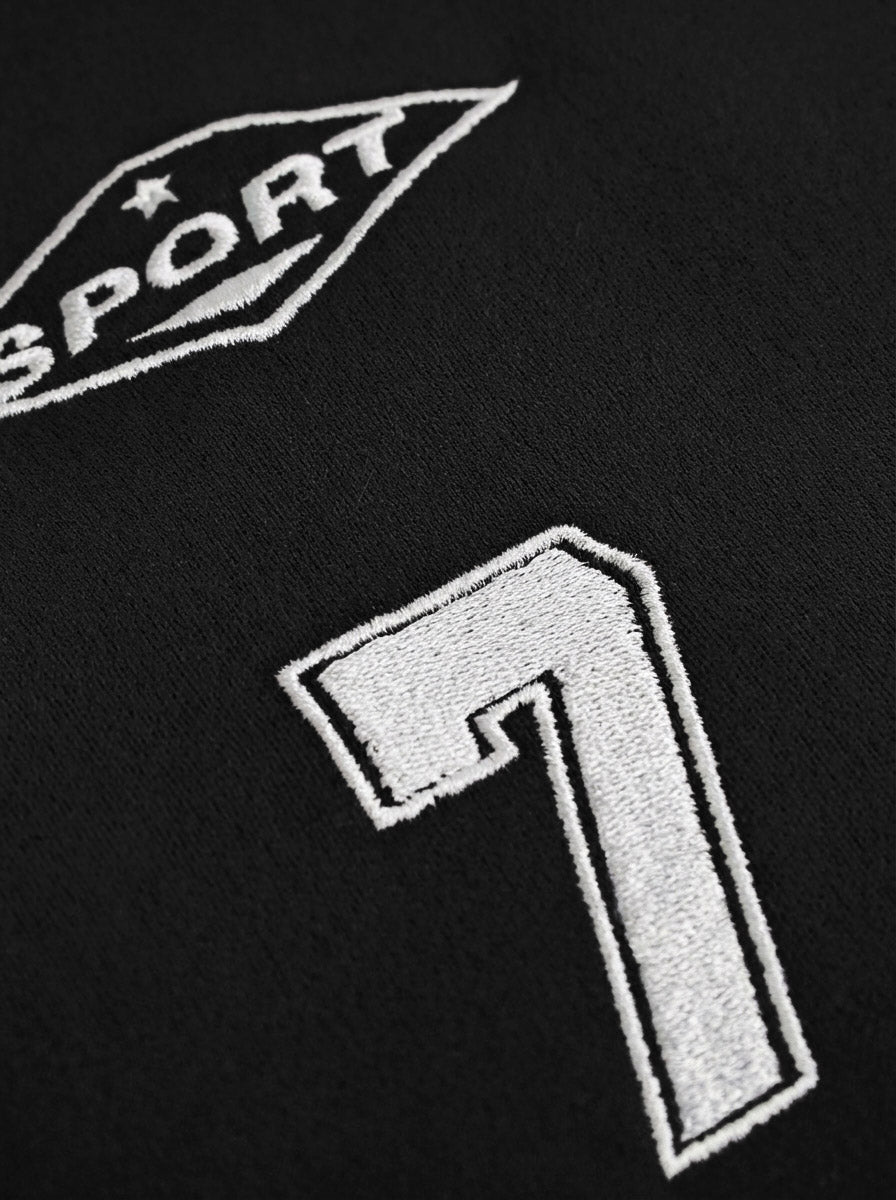 Sport-inspired T-shirt crafted from soft suede-touch fabric with a smooth, velvety hand feel. Designed with contrast color panel detailing for a dynamic athletic look. The chest logo and number “7” feature raised embroidery craftsmanship, adding texture, depth, and a premium varsity finish. Available in multiple color options for versatile styling.