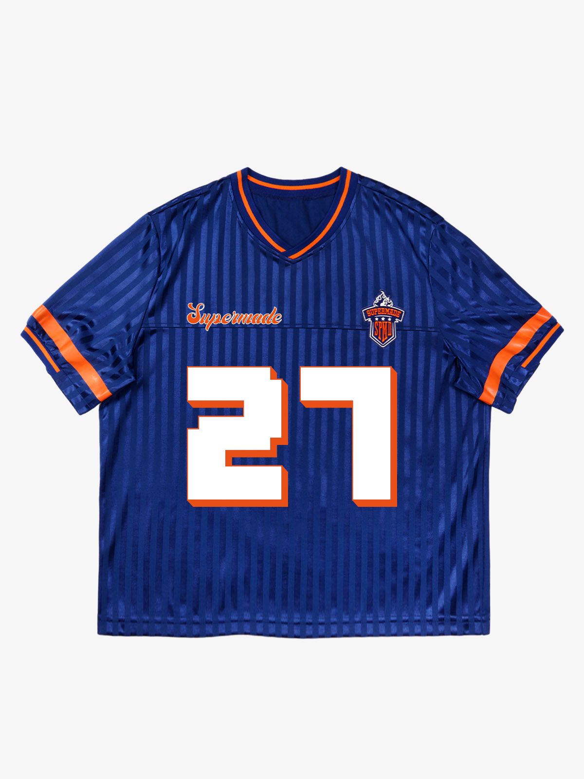 • Design Elements: Bold Number "27" with Brand Logo, Orange Accents on Sleeves and Collar, Vertical Stripe Pattern