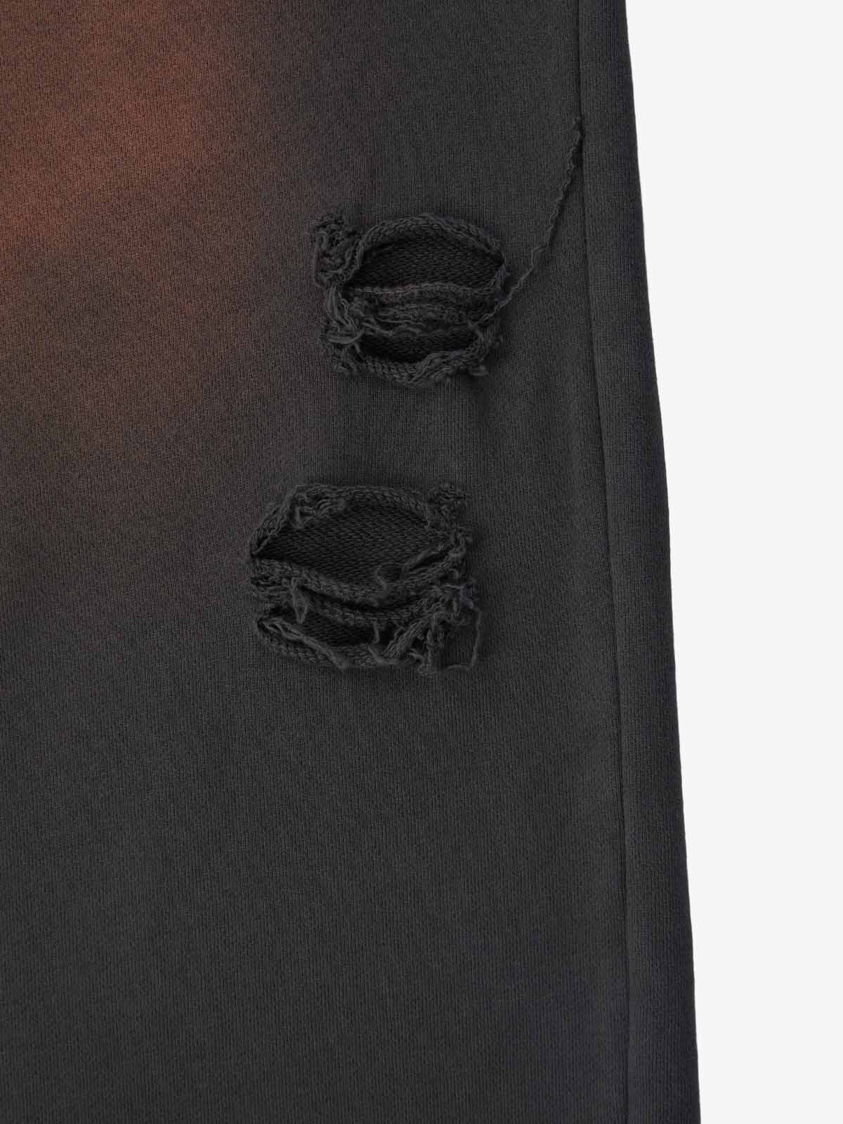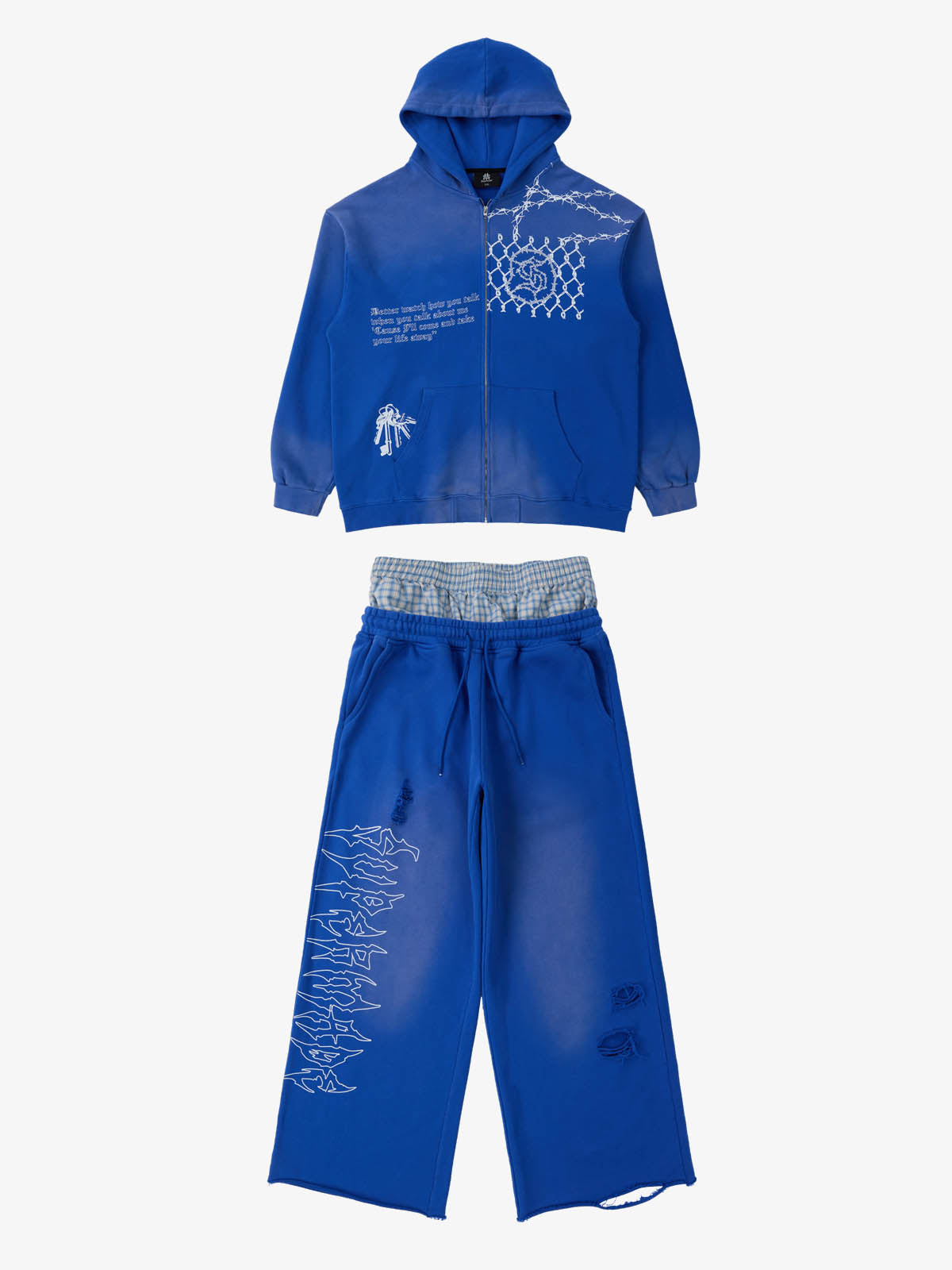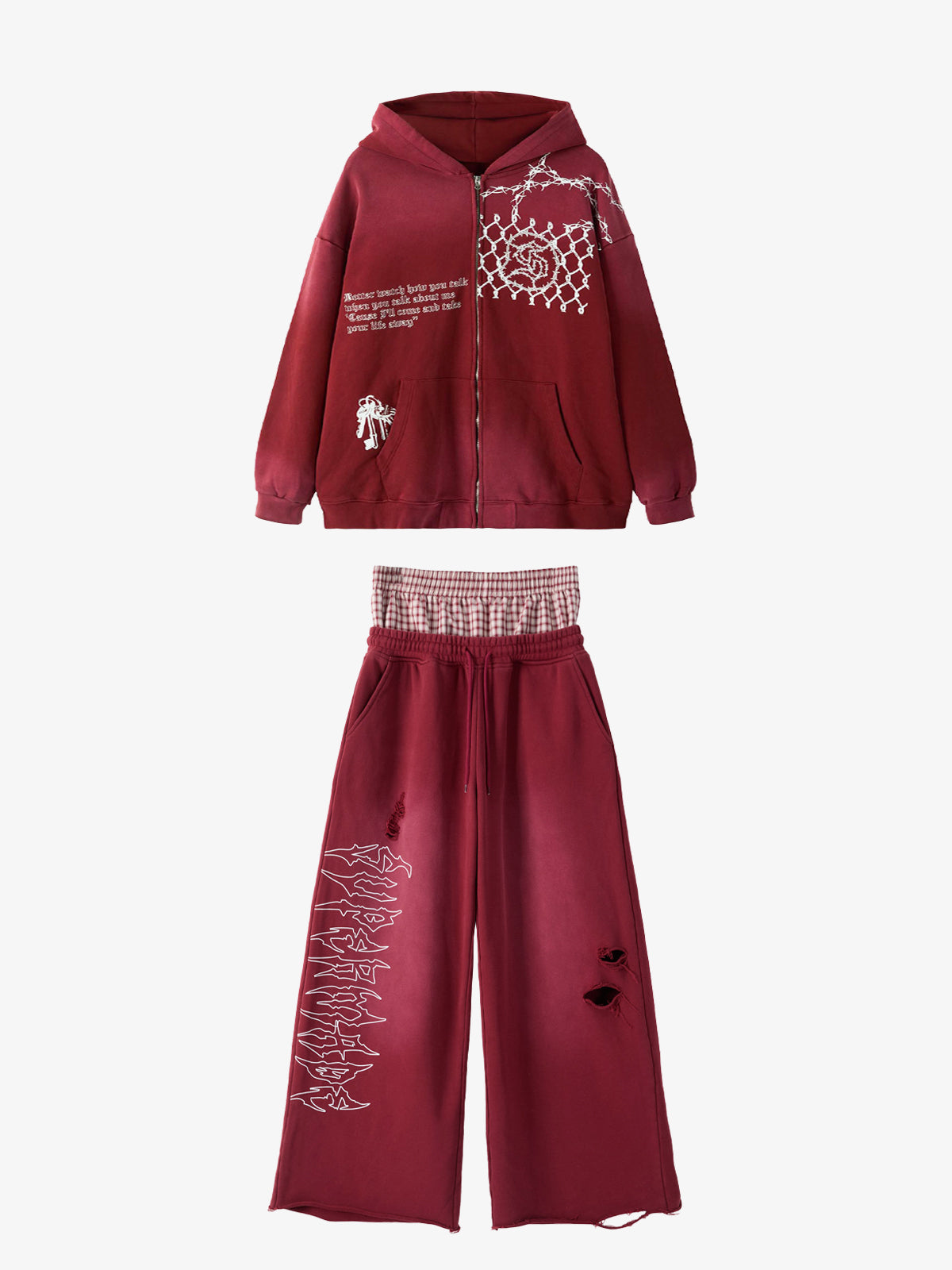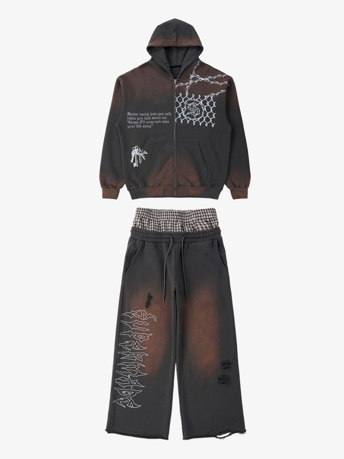 Detail Features: Vintage-inspired distressed print, patchwork design for added texture, sweatshirt fabric with a soft yet structured feel, coordinated top and bottom set