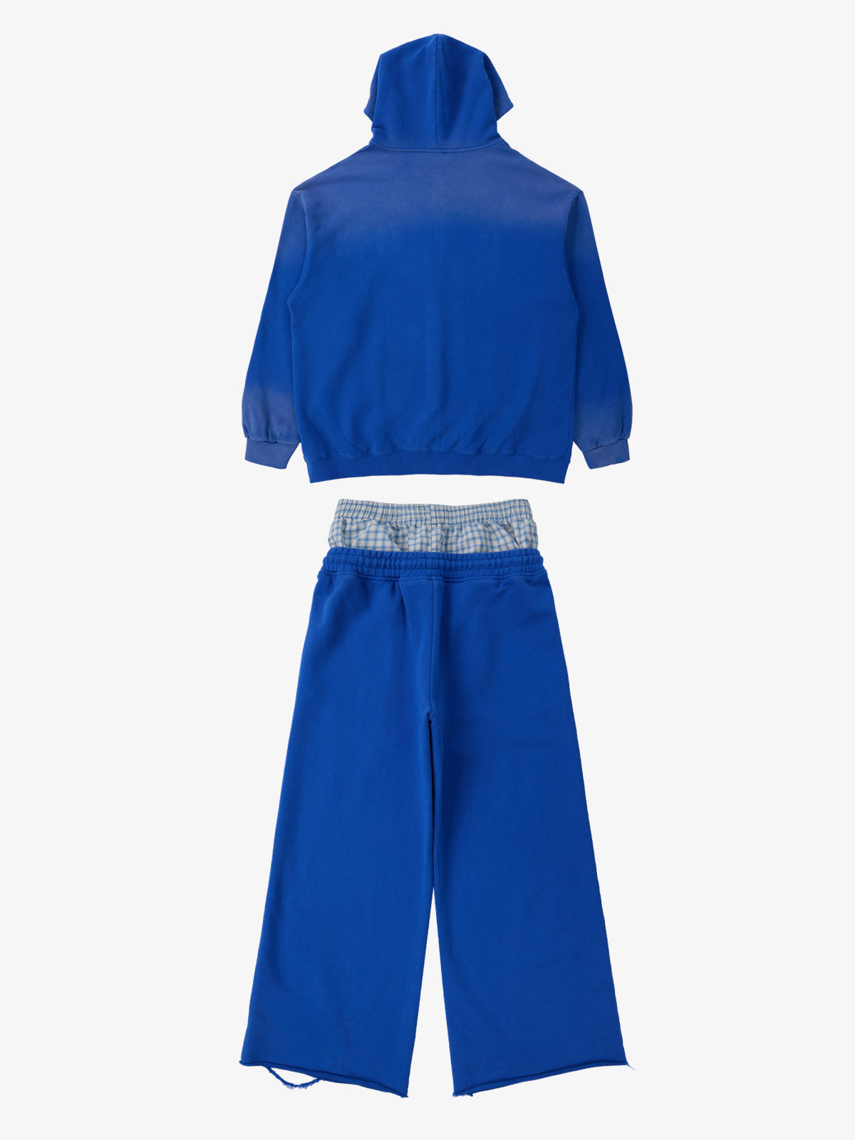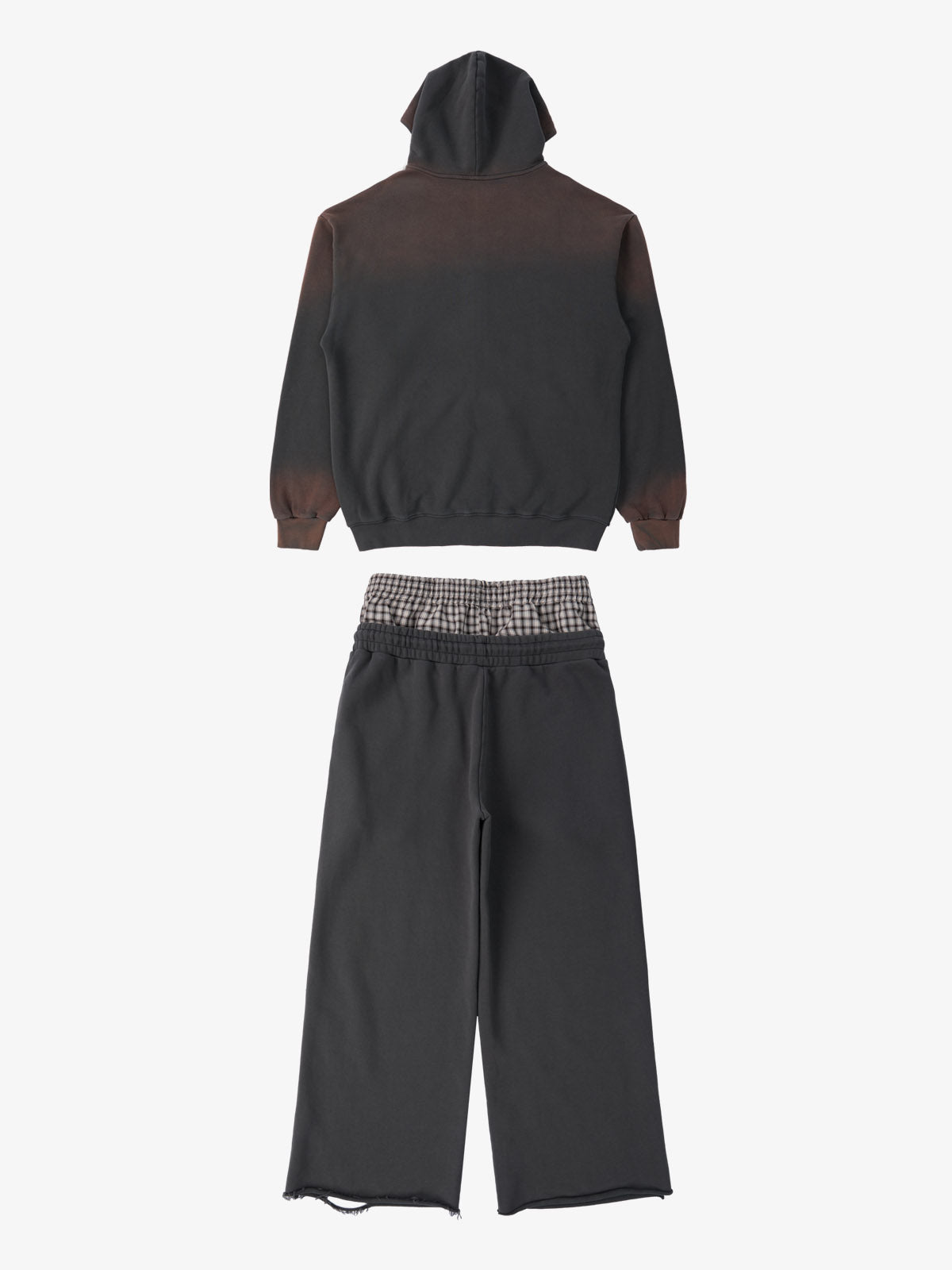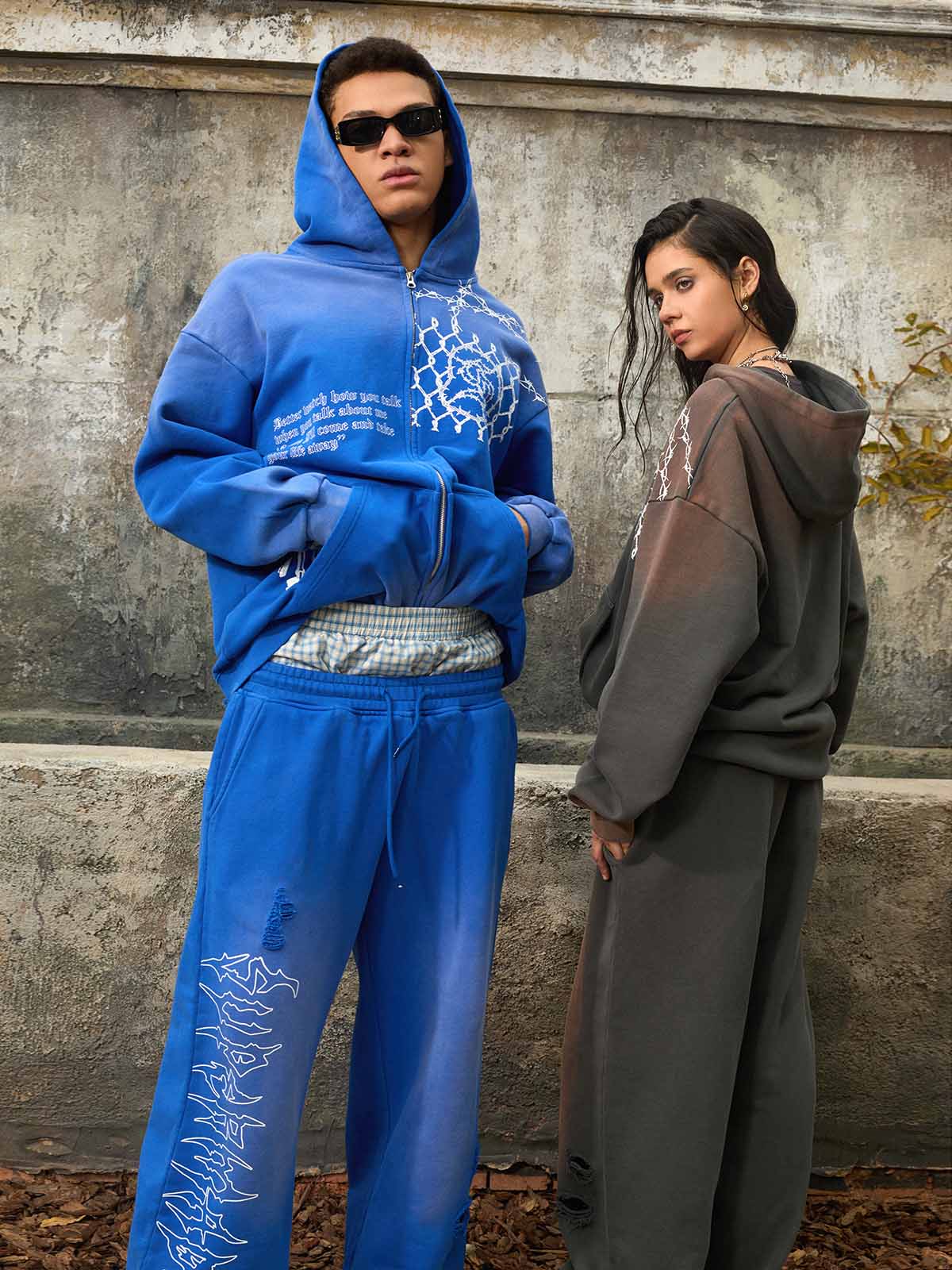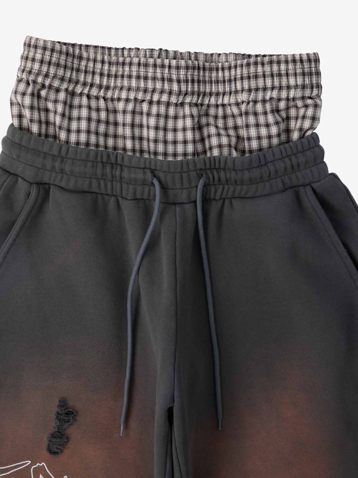 Detail Features: Vintage-inspired distressed print, patchwork design for added texture, sweatshirt fabric with a soft yet structured feel, coordinated top and bottom set