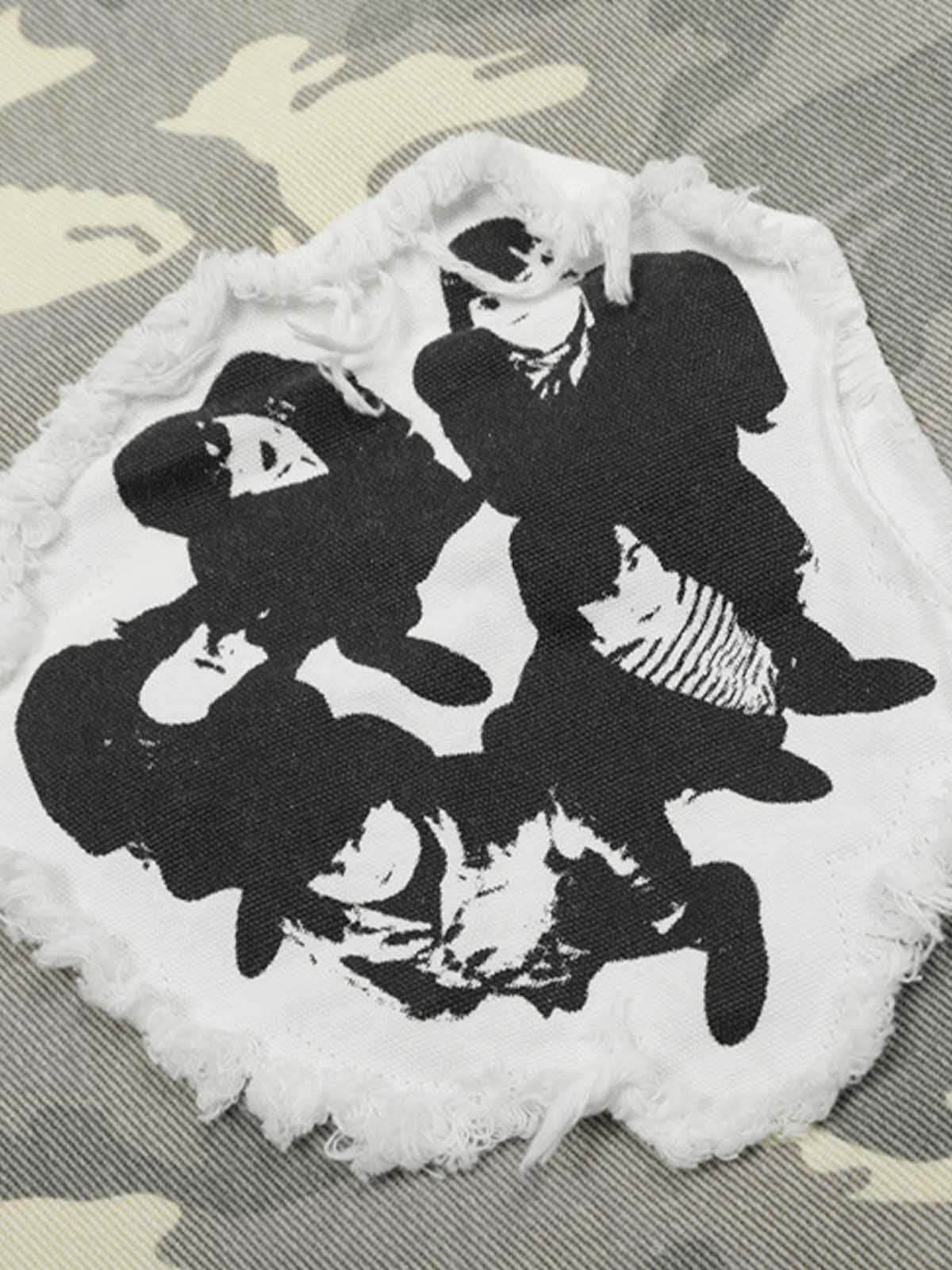 • Design Elements: Camouflage print pattern, distressed frayed hem, graphic patch decoration
