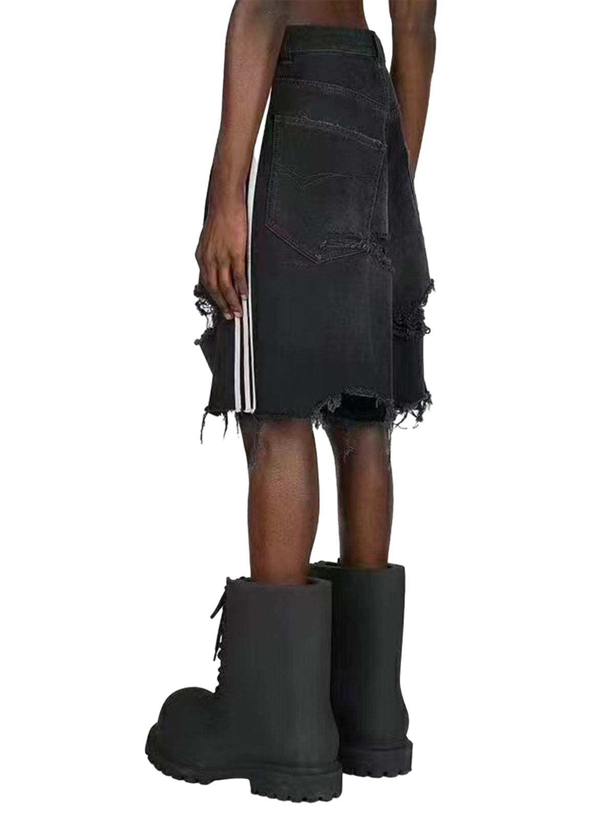 •    Design Elements: Distressed holes, frayed edges, and white striped accents on the sides