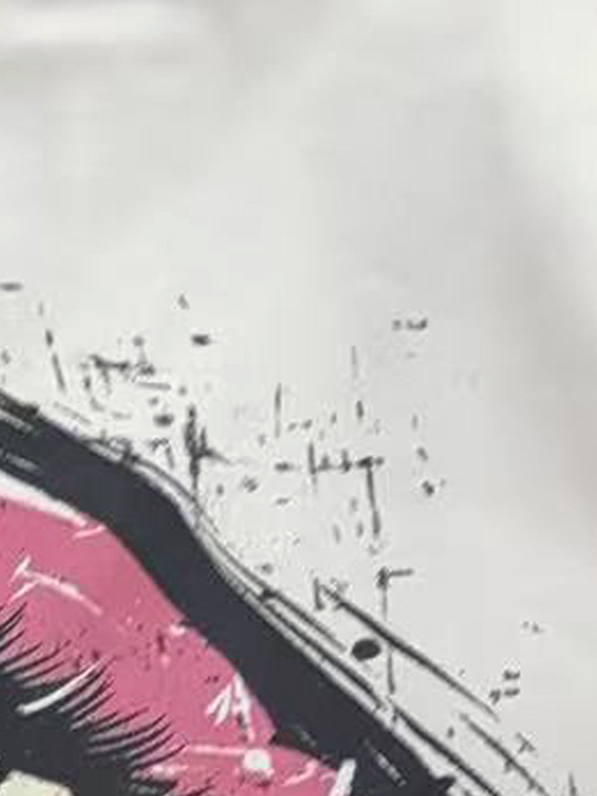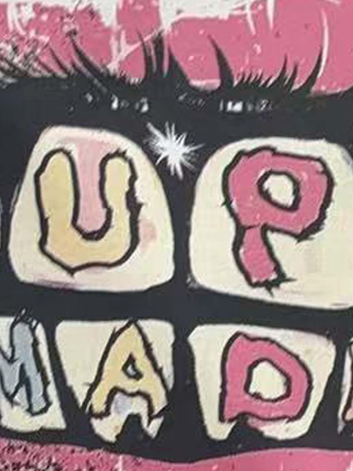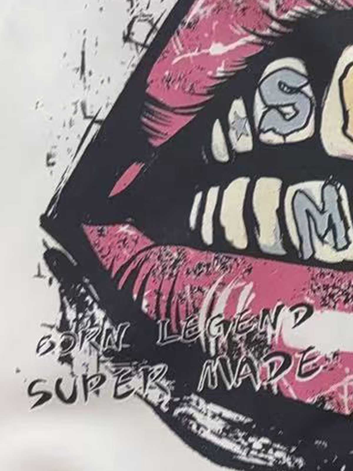 • Design Elements: Bold lip graphic print, distressed hem details, playful text overlay