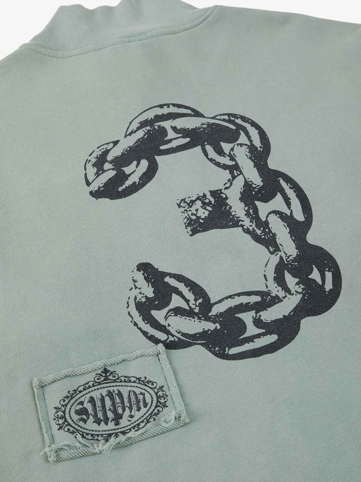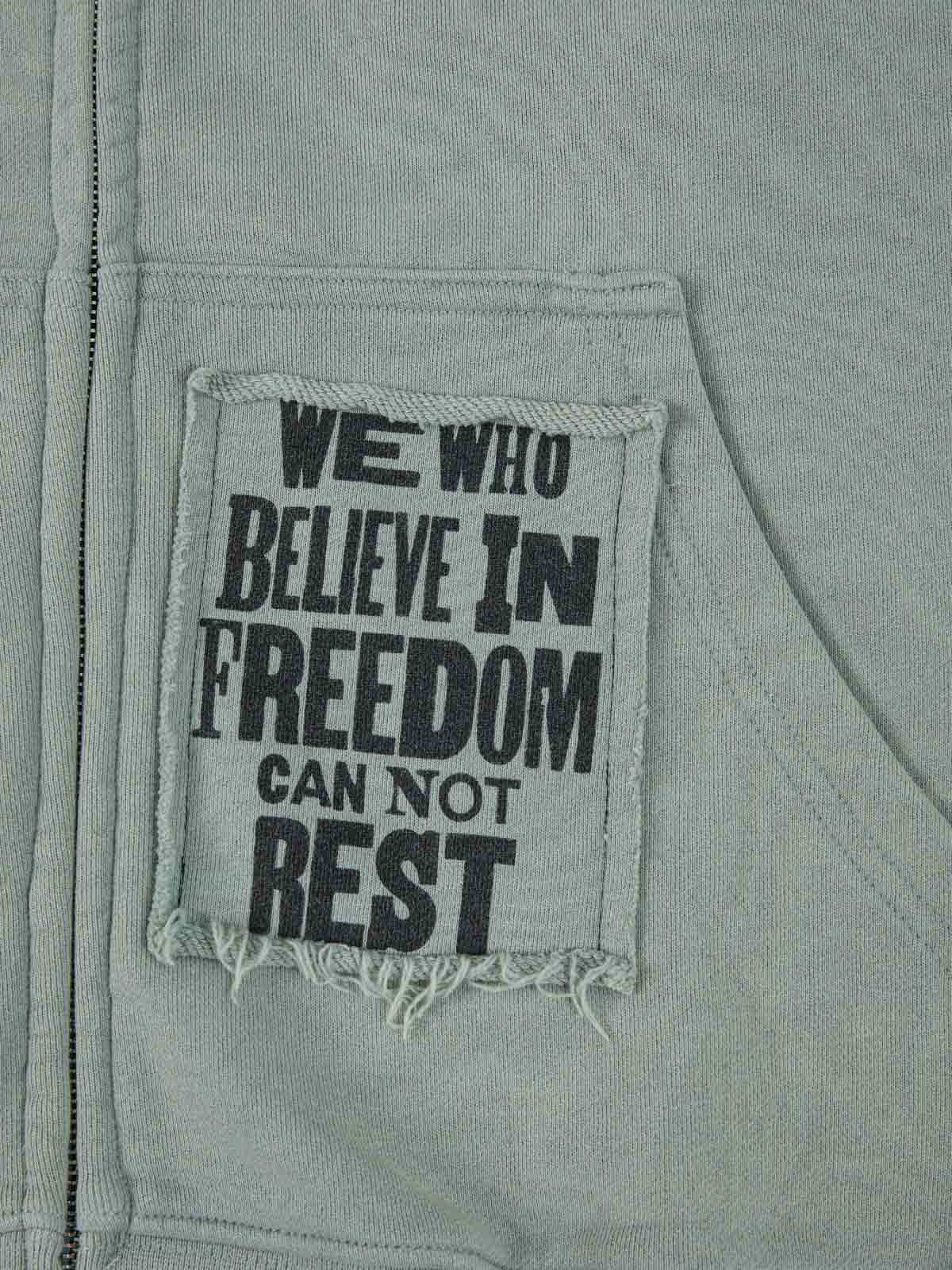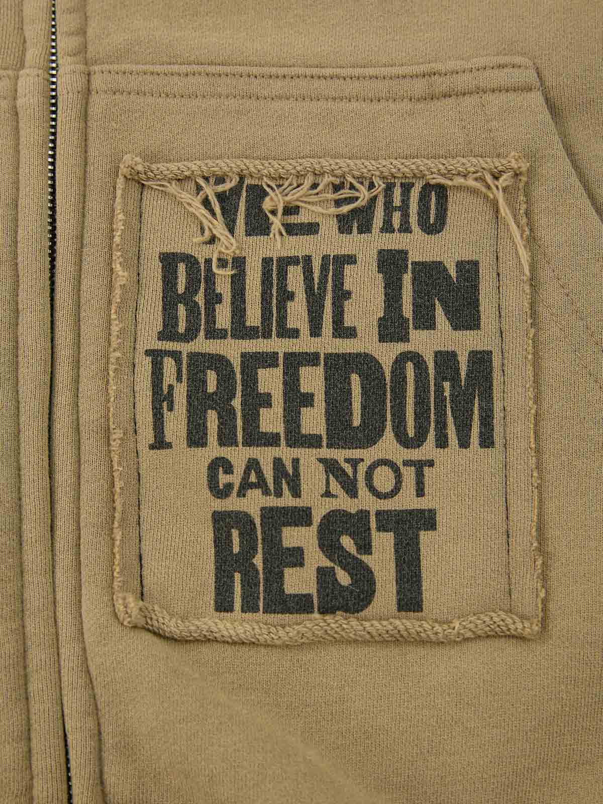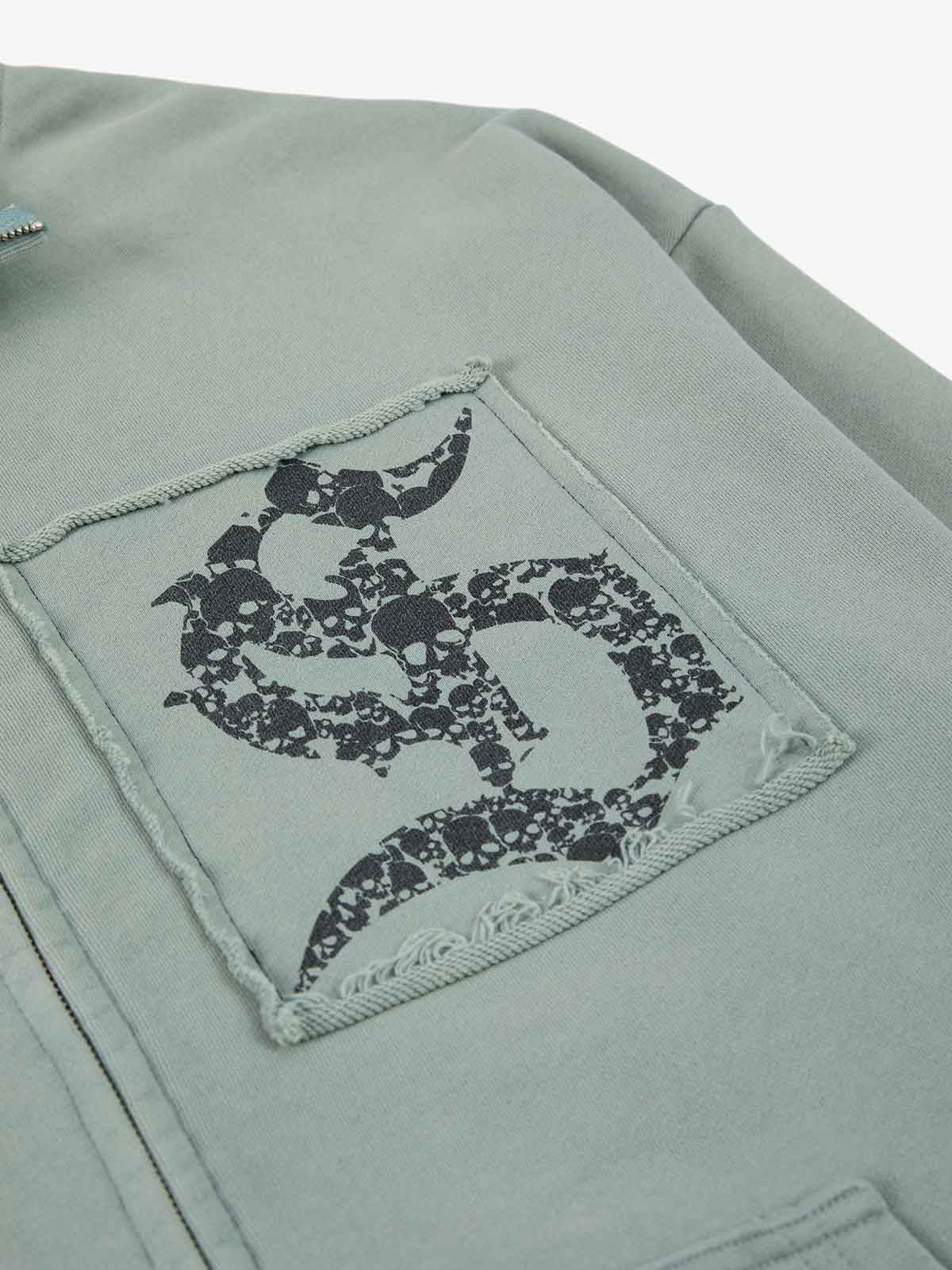 Constructed from cotton-blend sweatshirt fabric, this zip up piece features a washed vintage finish paired with multi-panel patchwork graphics for a rugged, archival street aesthetic. The design incorporates mixed typography, gothic lettering, and symbolic artwork across appliqué panels, creating layered visual depth. A stand collar and full zip closure balance the distressed detailing with a structured, everyday-wear silhouette.