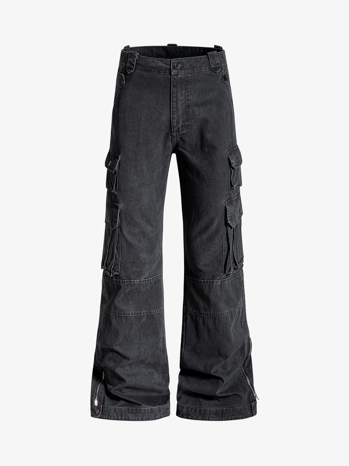 These vintage washed cargo pants blend classic workwear utility with a bold streetwear silhouette. Crafted from durable cotton fabric, the pants feature a faded washed finish that gives them a worn-in texture and relaxed feel. Multiple cargo pockets along the legs enhance the functional aesthetic, while adjustable strap details add a unique technical touch. The slightly flared leg design combined with zipper openings at the hem allows for flexible styling and movement, making them easy to pair with sneakers or boots for a modern street look.