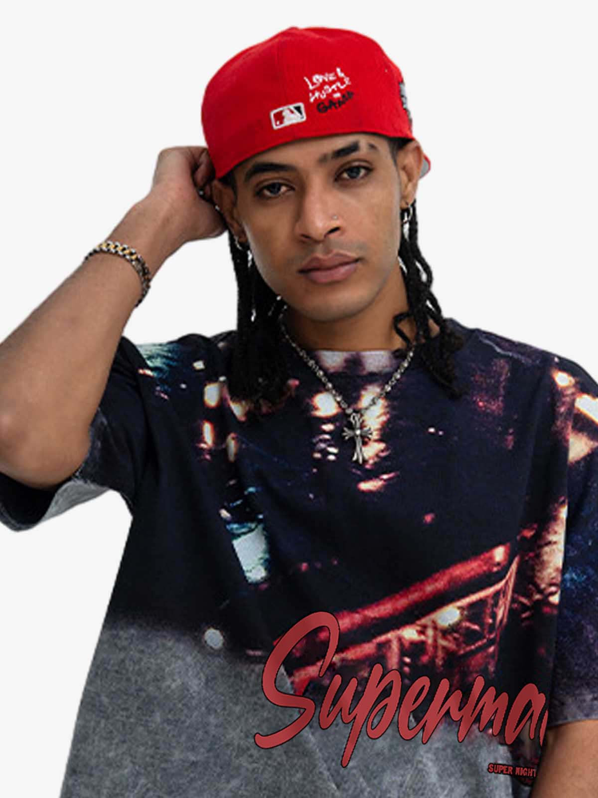 A washed graphic T-shirt featuring a blurred city night photo print across the upper body. The faded streetlight imagery and soft washed finish give the piece a nostalgic urban mood. The oversized silhouette makes it easy to wear with denim or cargo pants for everyday street styling.